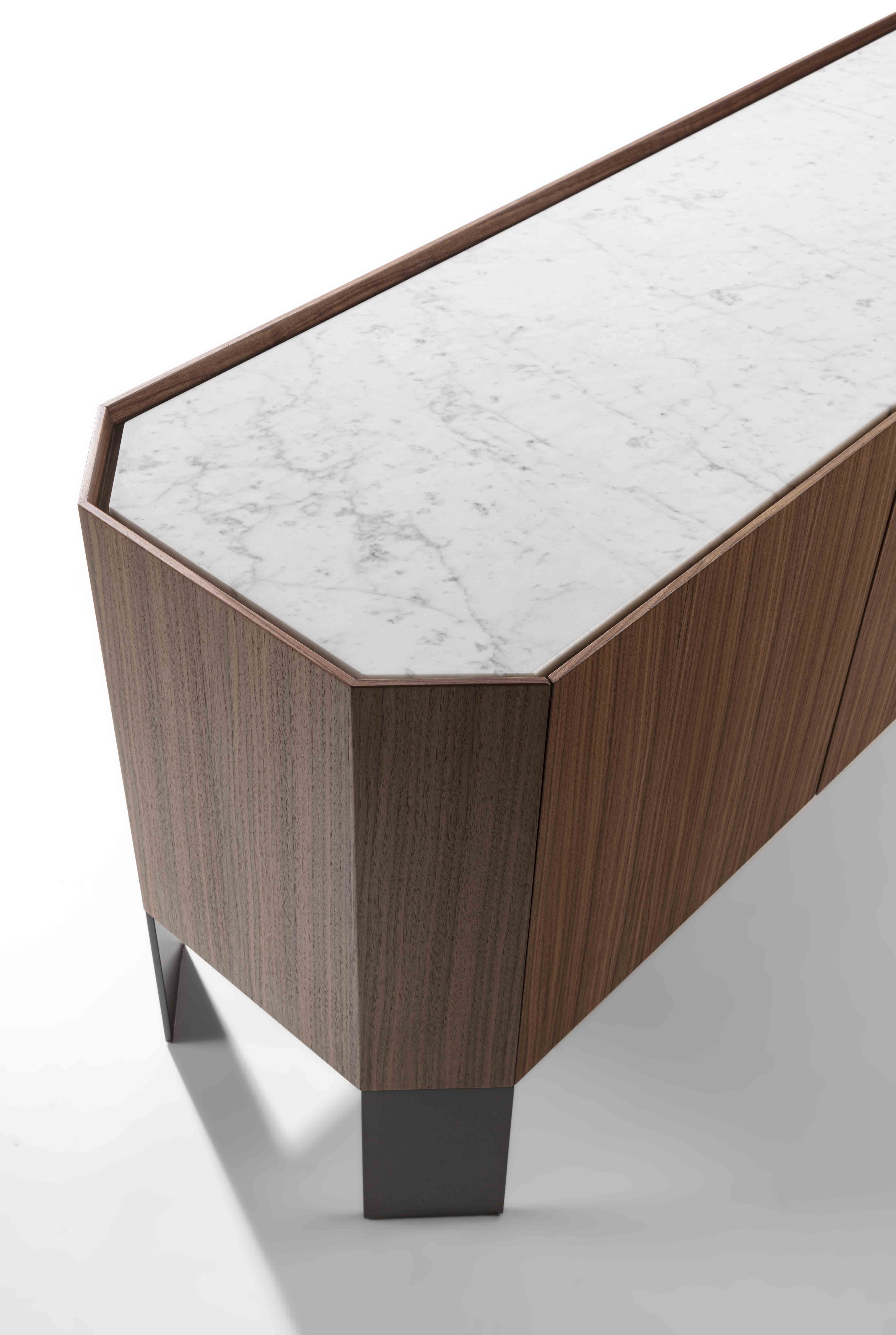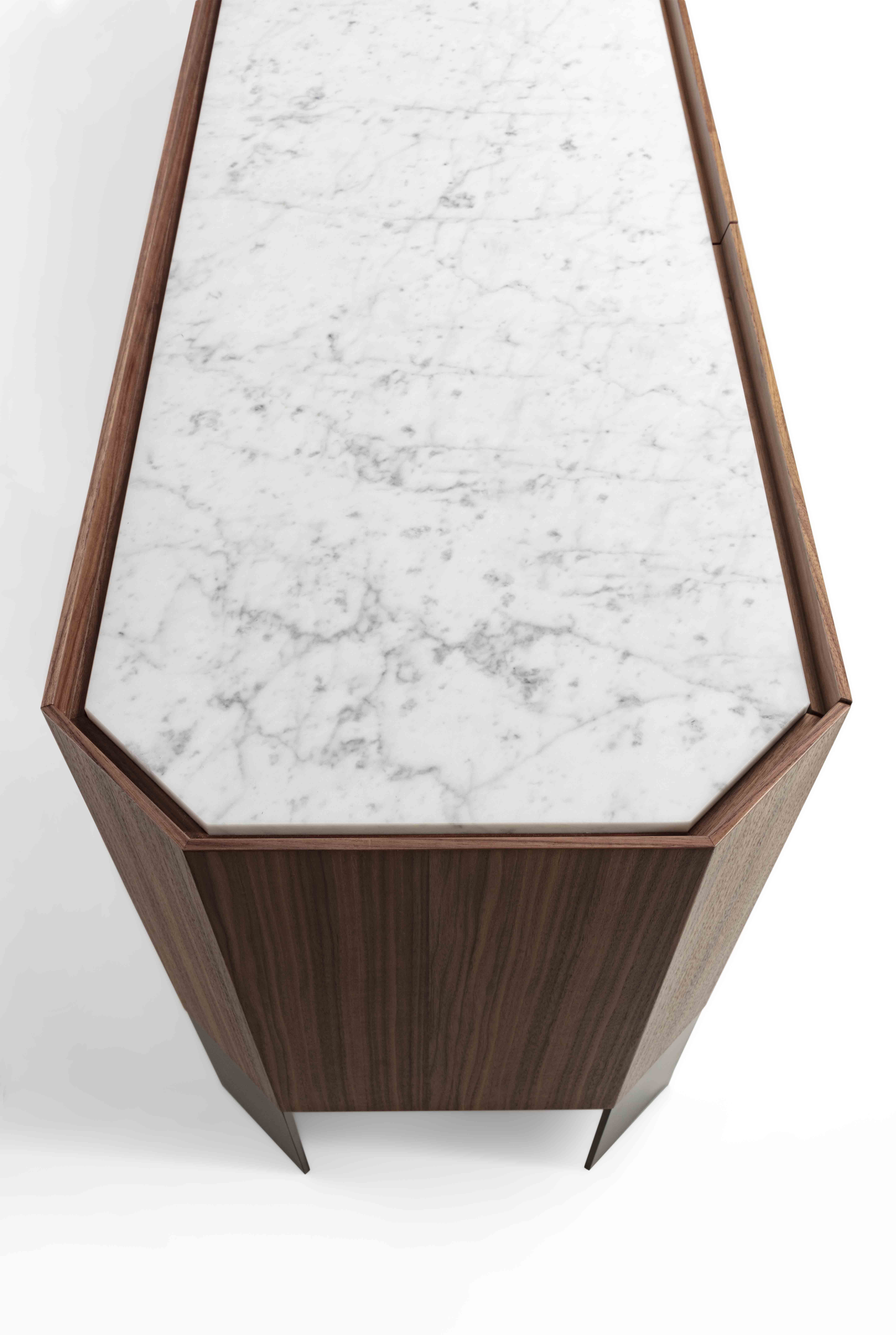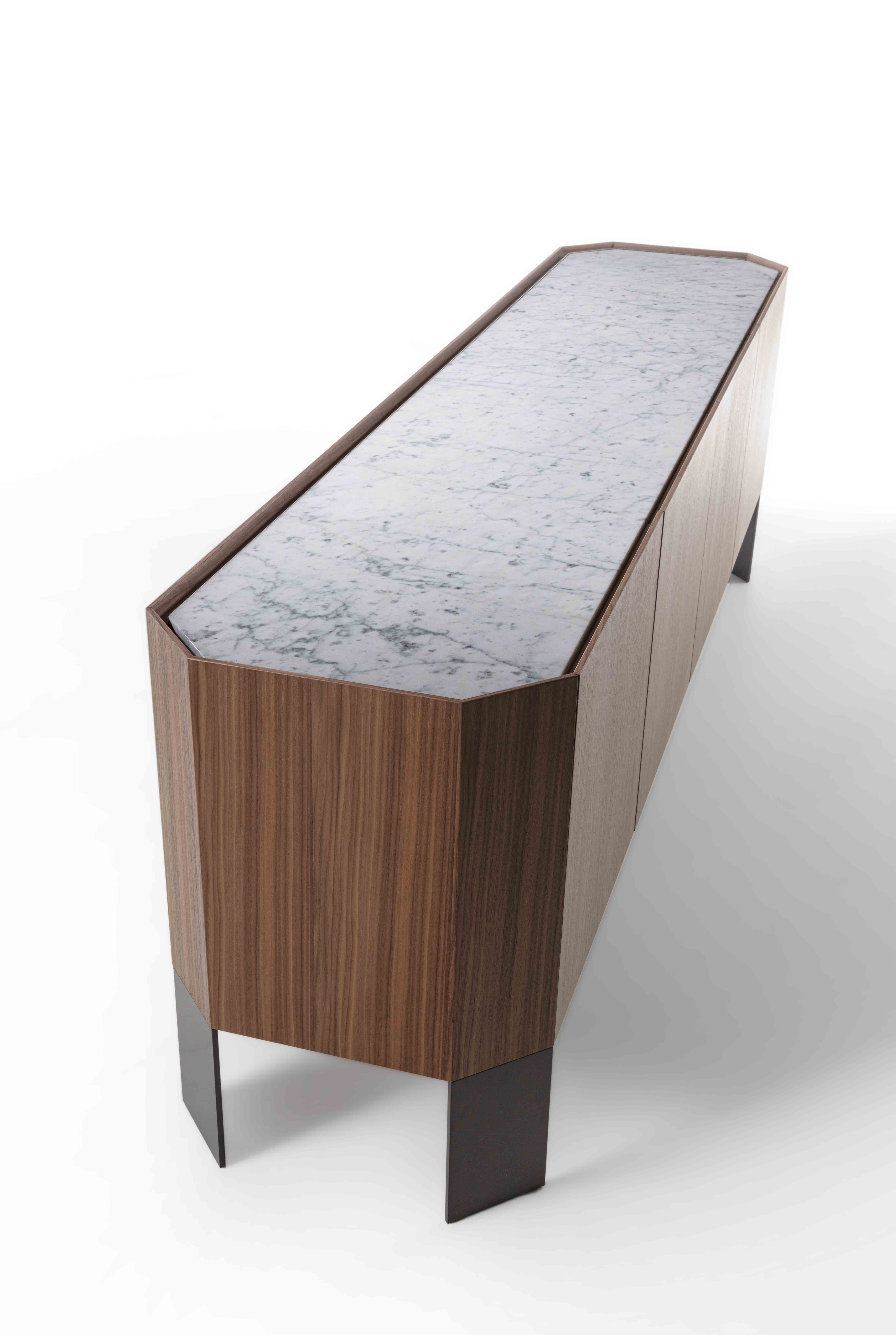 Struttura: legno massello e tranciato di noce canaletto / rovere / rovere nero. Piano: marmo. Ante: legno massello e tranciato di noce canaletto / rovere / rovere nero. Gambe: metallo laccato bronzo / canna di fucile.