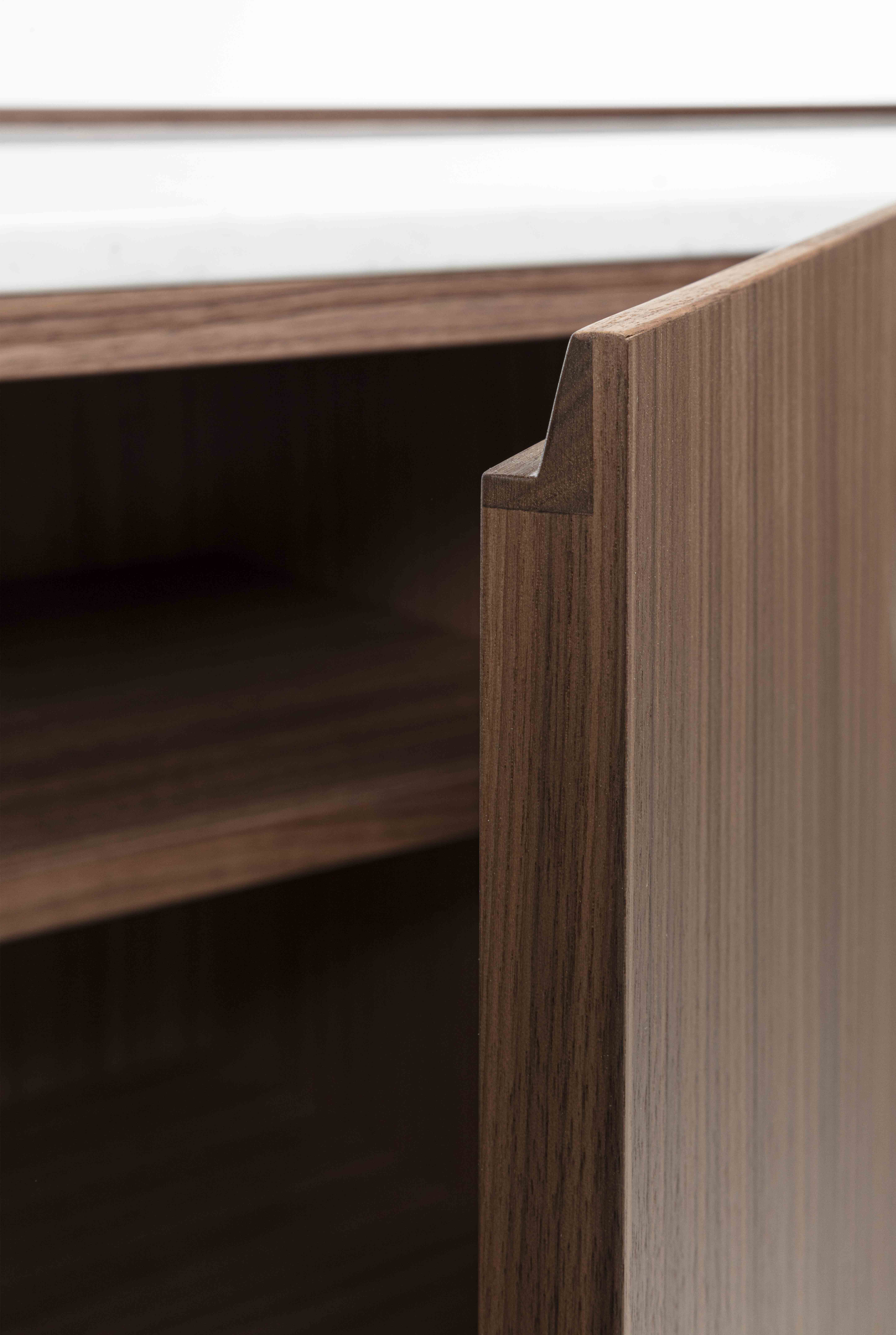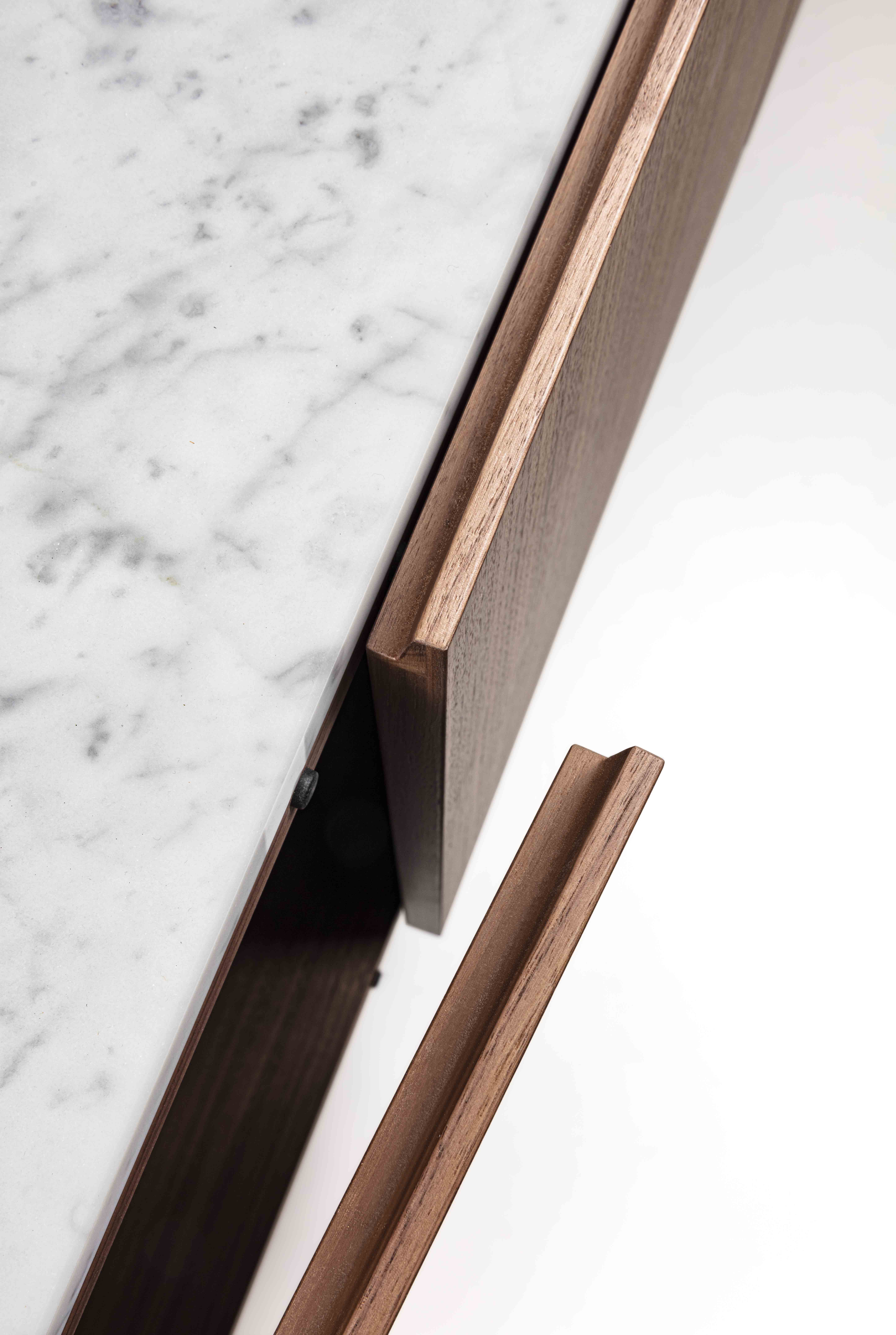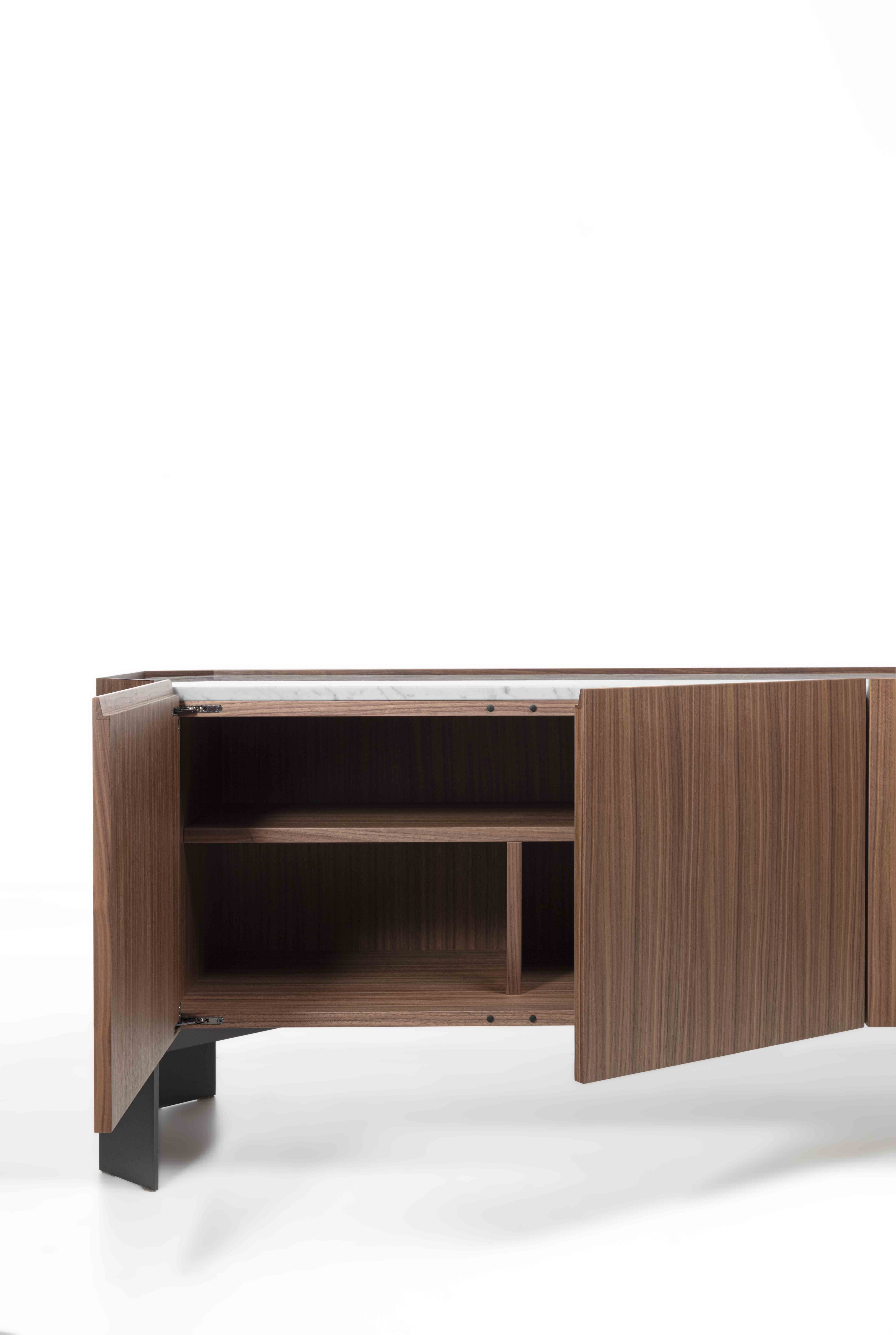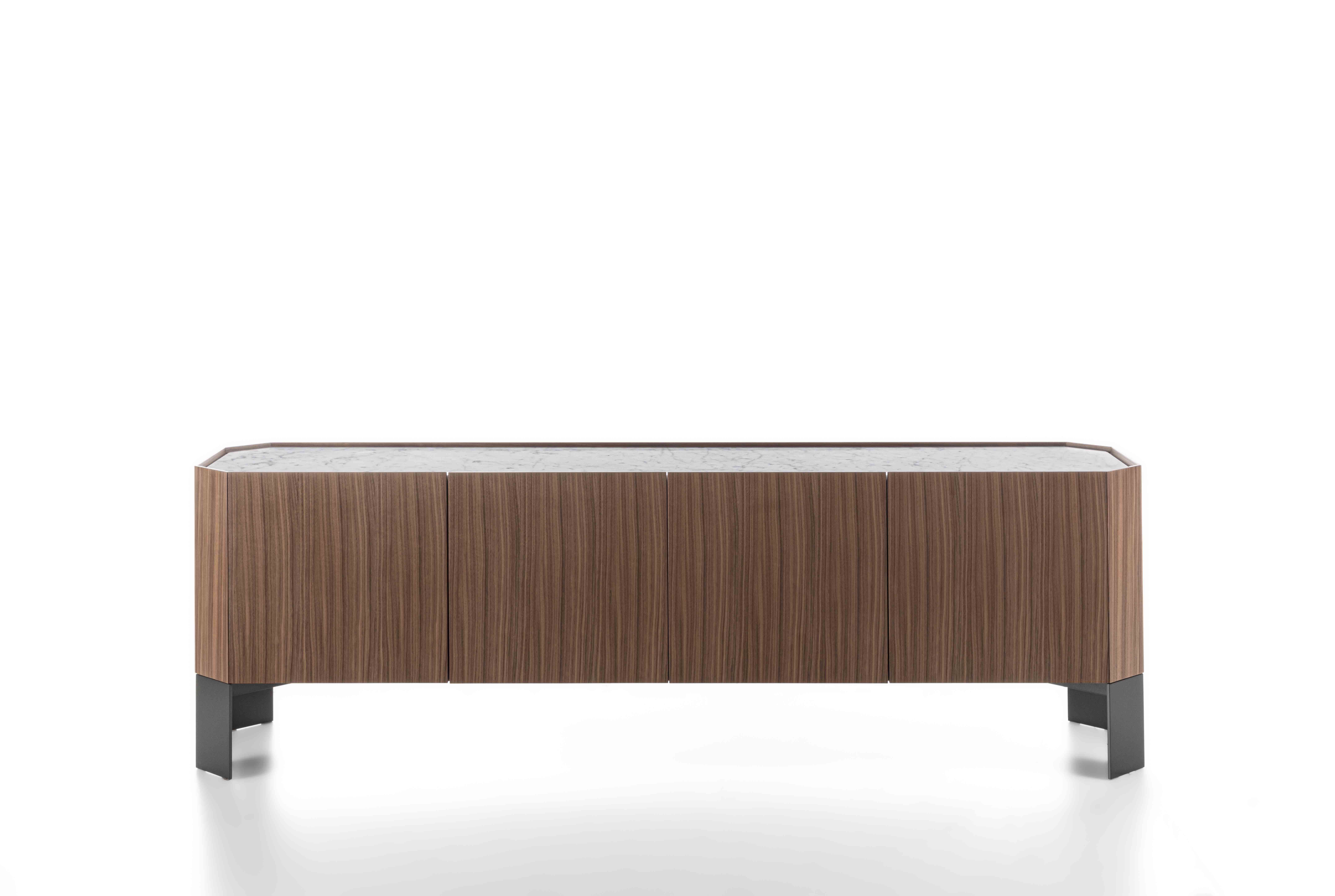 Struttura: legno massello e tranciato di noce canaletto / rovere / rovere nero. Piano: marmo. Ante: legno massello e tranciato di noce canaletto / rovere / rovere nero. Gambe: metallo laccato bronzo / canna di fucile.