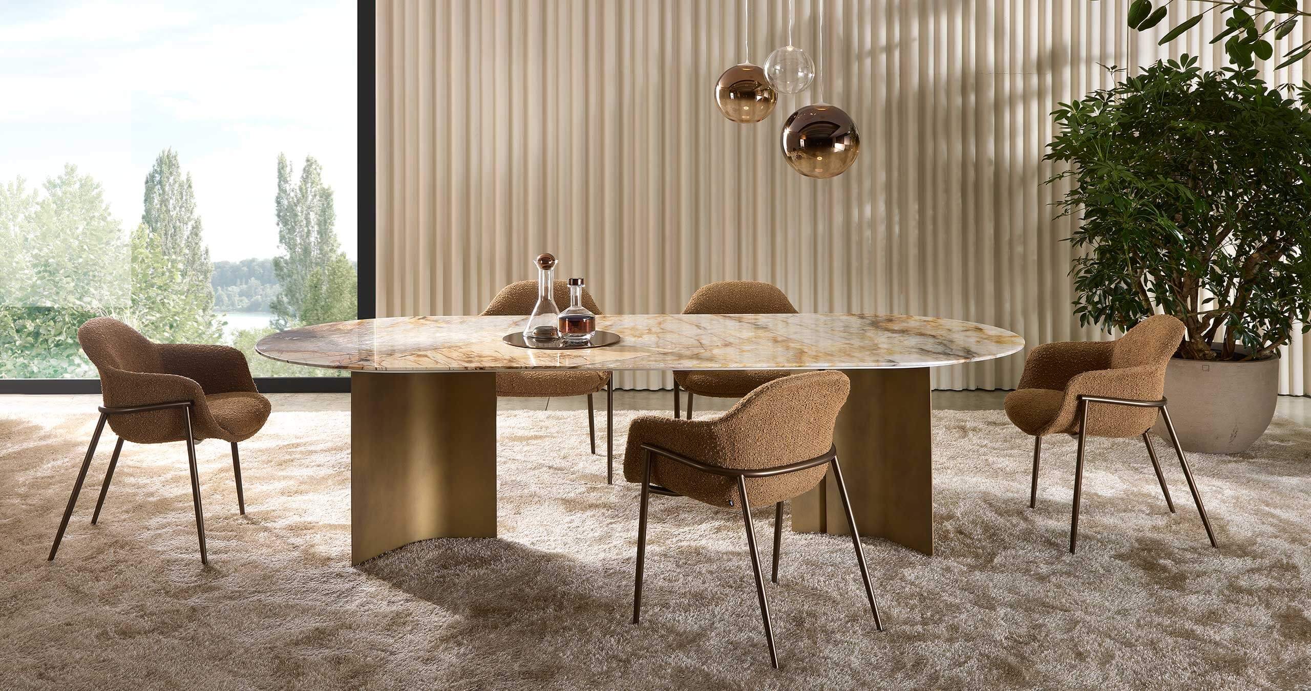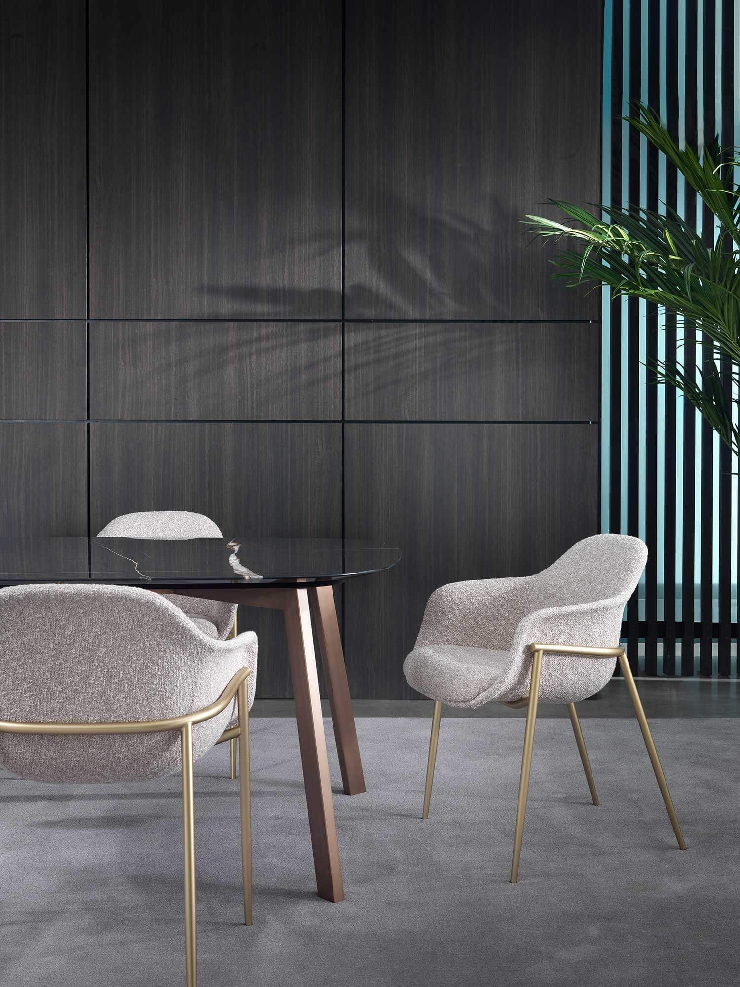 Pensata per rispondere alle esigenze di architetti e interior designer, si distingue per la varietà dei suoi basamenti, che le permettono di adattarsi con disinvoltura a contesti diversi. La versione con quattro gambe, disponibile in metallo o legno, coniuga solidità e leggerezza, rendendola perfetta per ambienti residenziali dal carattere ricercato. Per gli ambienti contract, è disponibile con colonna centrale, proposta con base tonda o a quattro razze, perfetta per uffici, ristoranti e hotel che necessitano di funzionalità senza rinunciare all’eleganza.