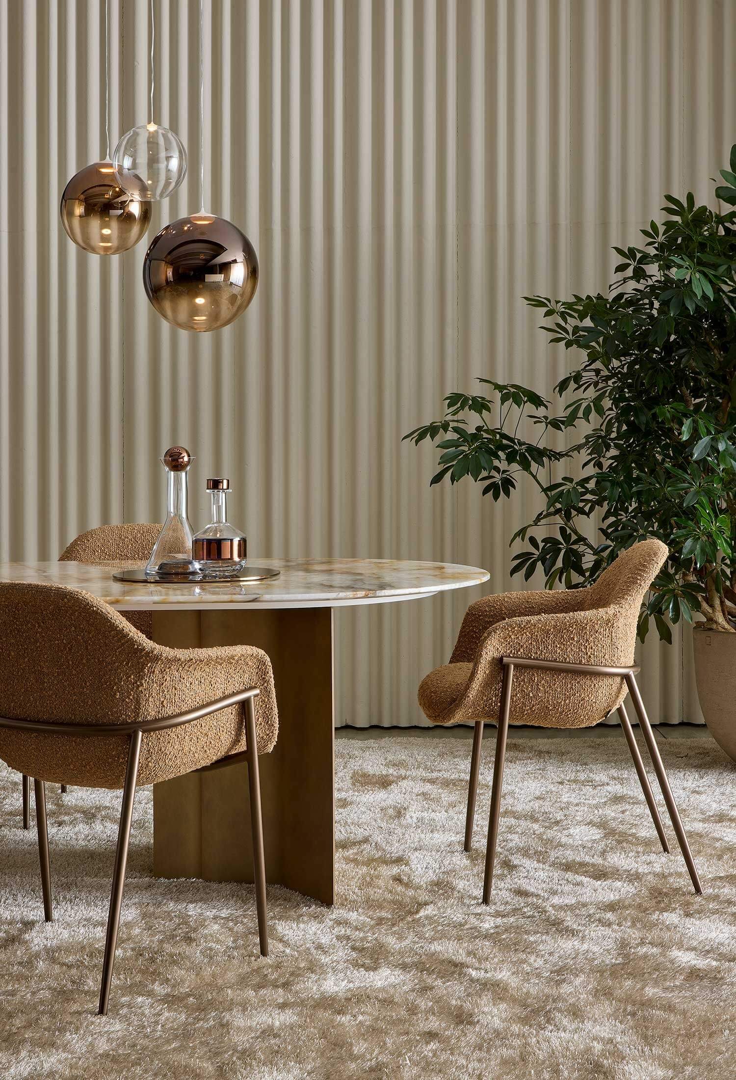 Pensata per rispondere alle esigenze di architetti e interior designer, si distingue per la varietà dei suoi basamenti, che le permettono di adattarsi con disinvoltura a contesti diversi. La versione con quattro gambe, disponibile in metallo o legno, coniuga solidità e leggerezza, rendendola perfetta per ambienti residenziali dal carattere ricercato. Per gli ambienti contract, è disponibile con colonna centrale, proposta con base tonda o a quattro razze, perfetta per uffici, ristoranti e hotel che necessitano di funzionalità senza rinunciare all’eleganza.