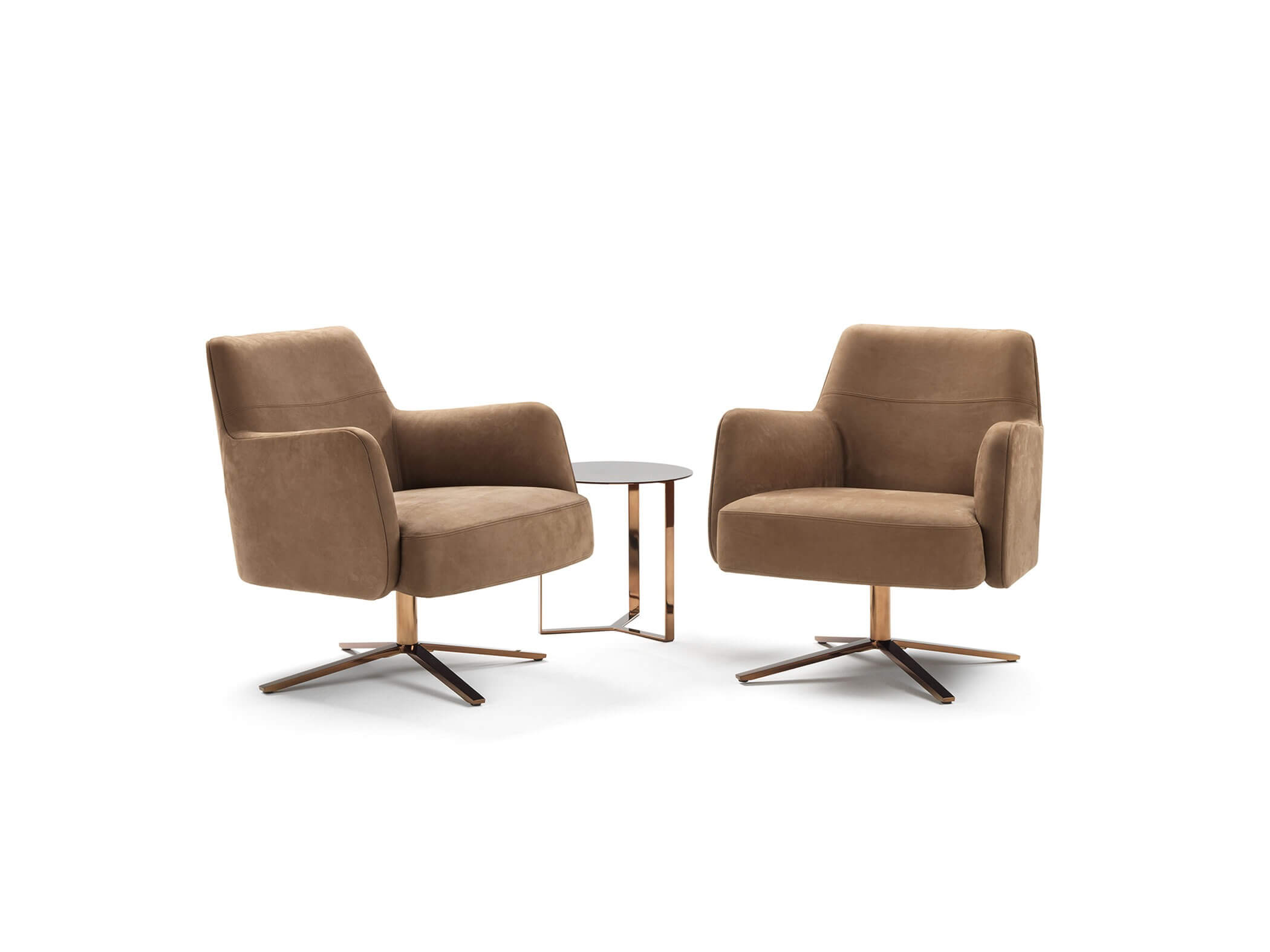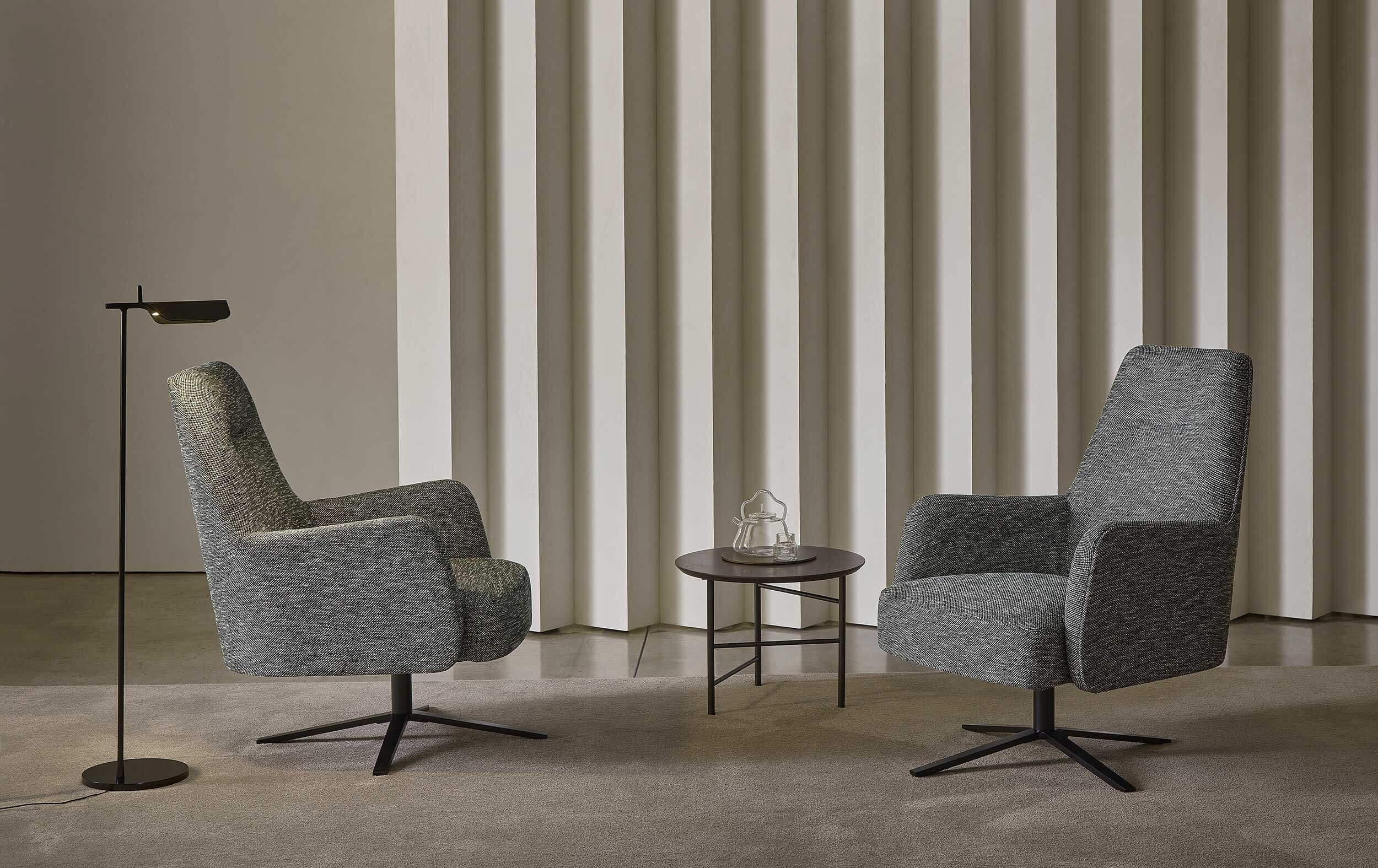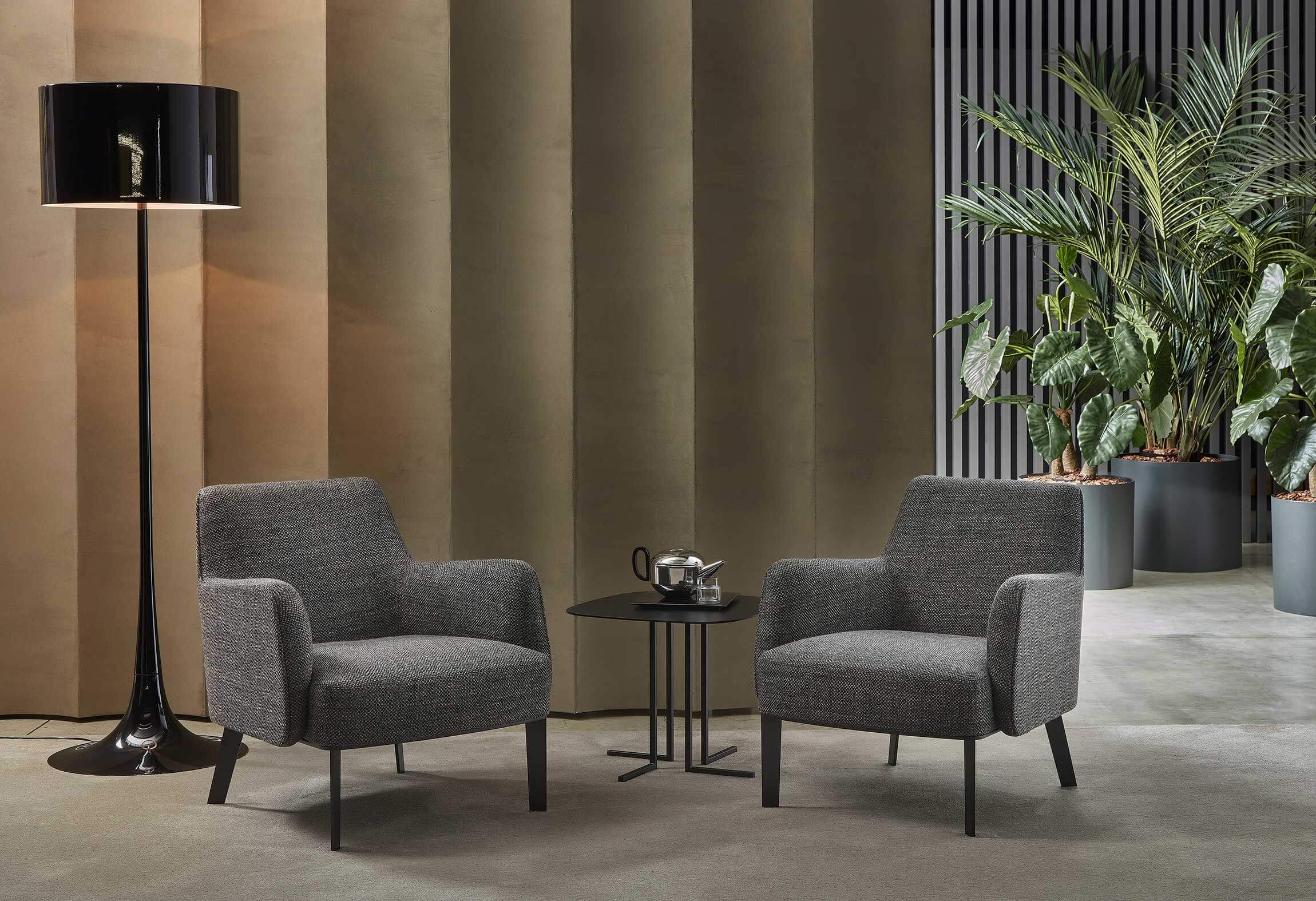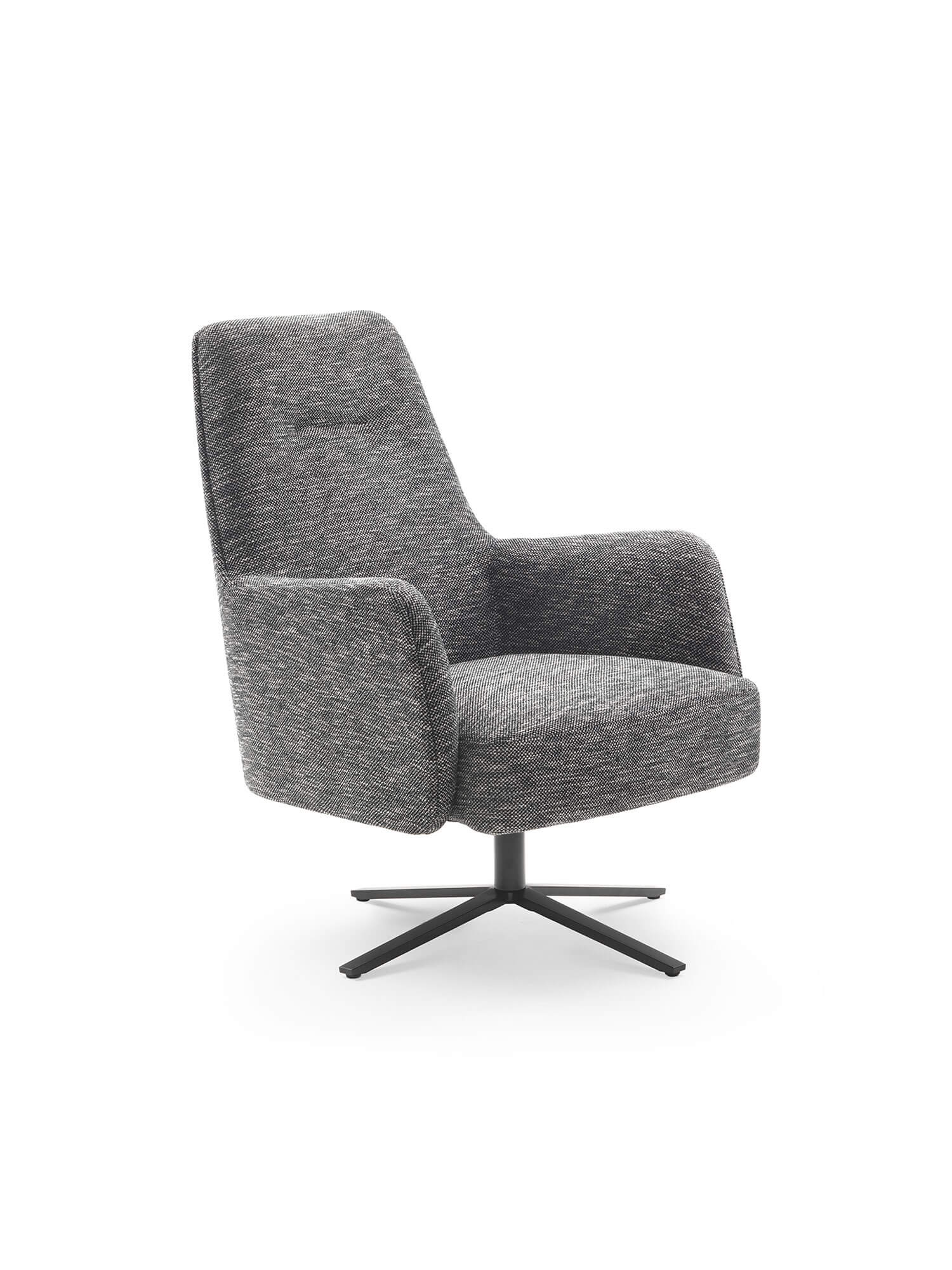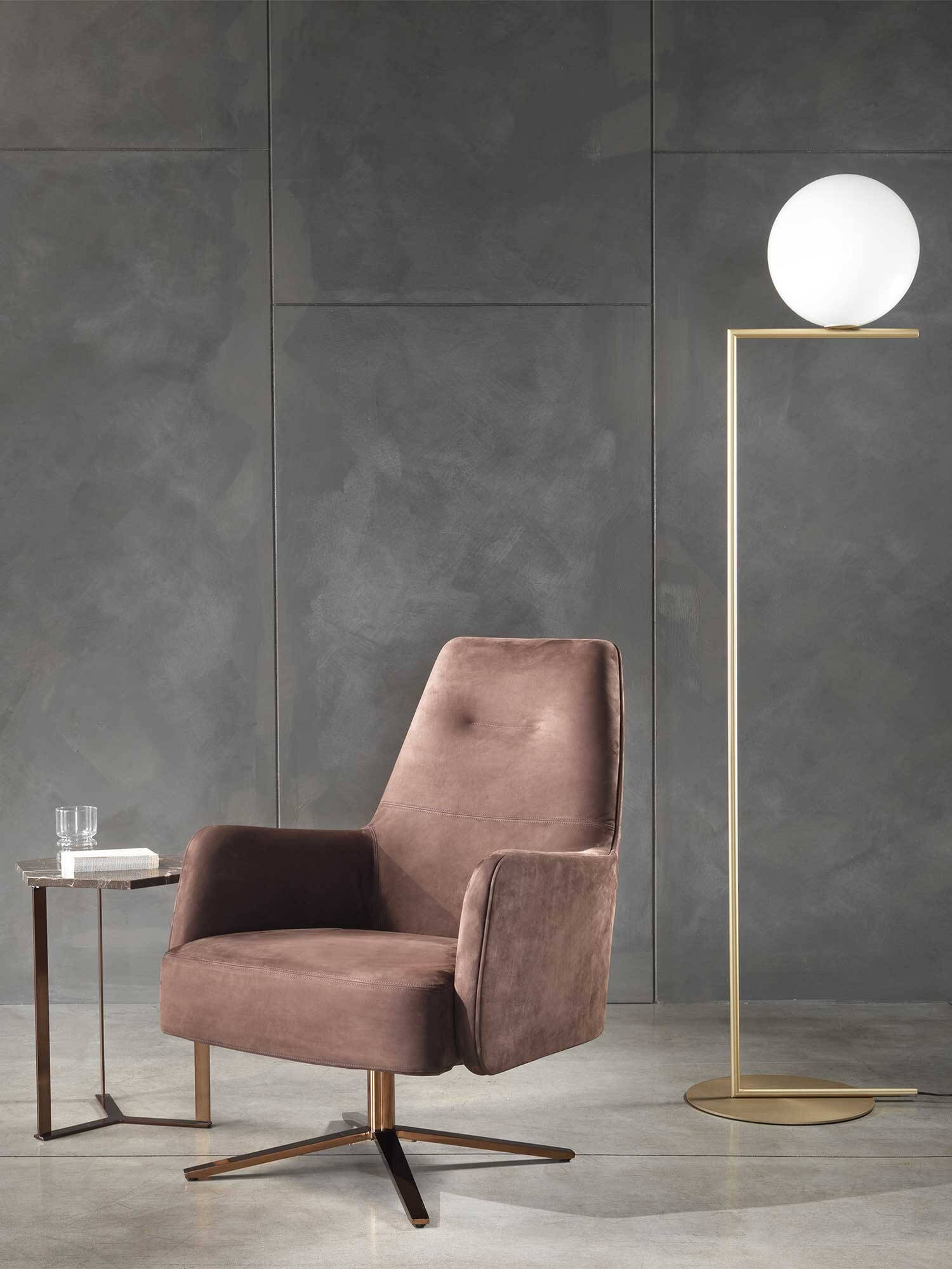 La poltrona Clipper si presenta in una gamma di diverse opzioni: scocca alta o bassa, gambe in legno o metallo ed una versione girevole in metallo.