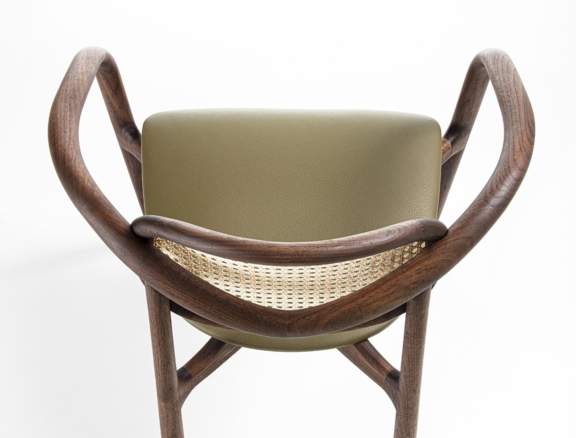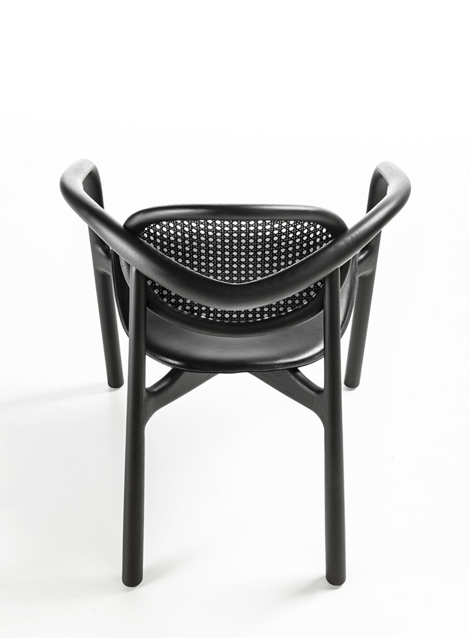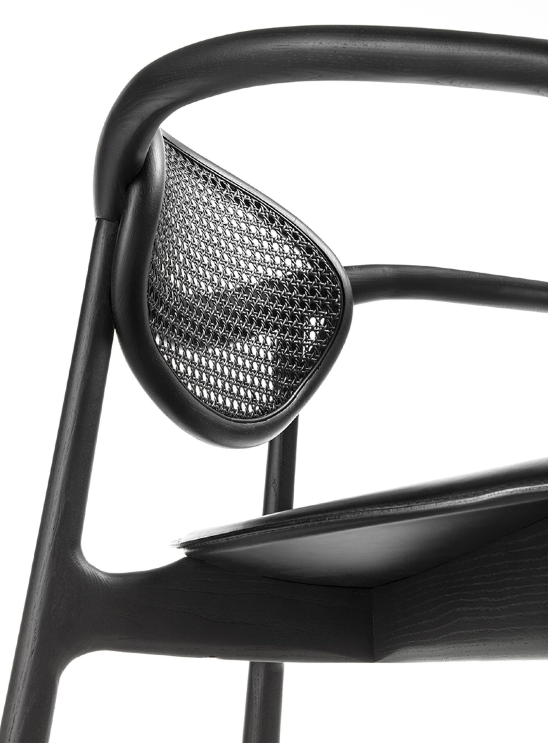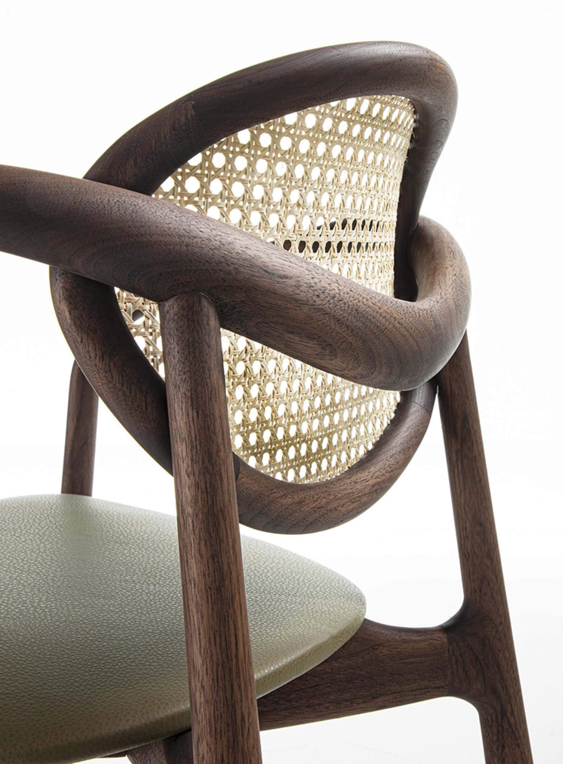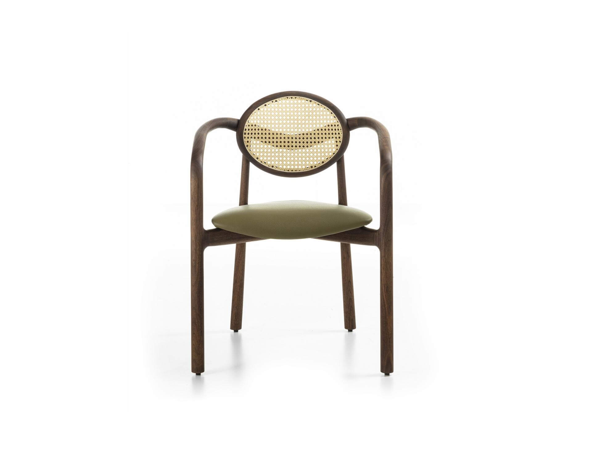 Poltroncina con struttura in legno massello con sezione irregolare disponibile in frassino o noce canaletto. Schienalino in paglia di Vienna disponibile nei colori naturale o nero. Sedile rivestito in diversi materiali disponibili.