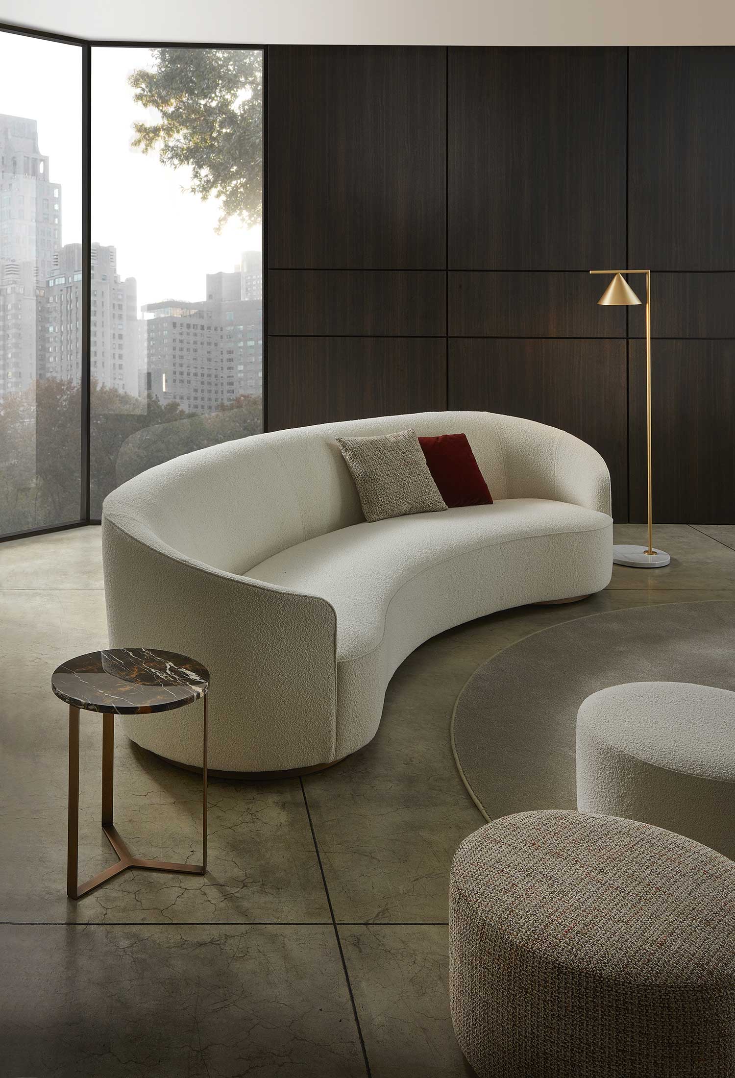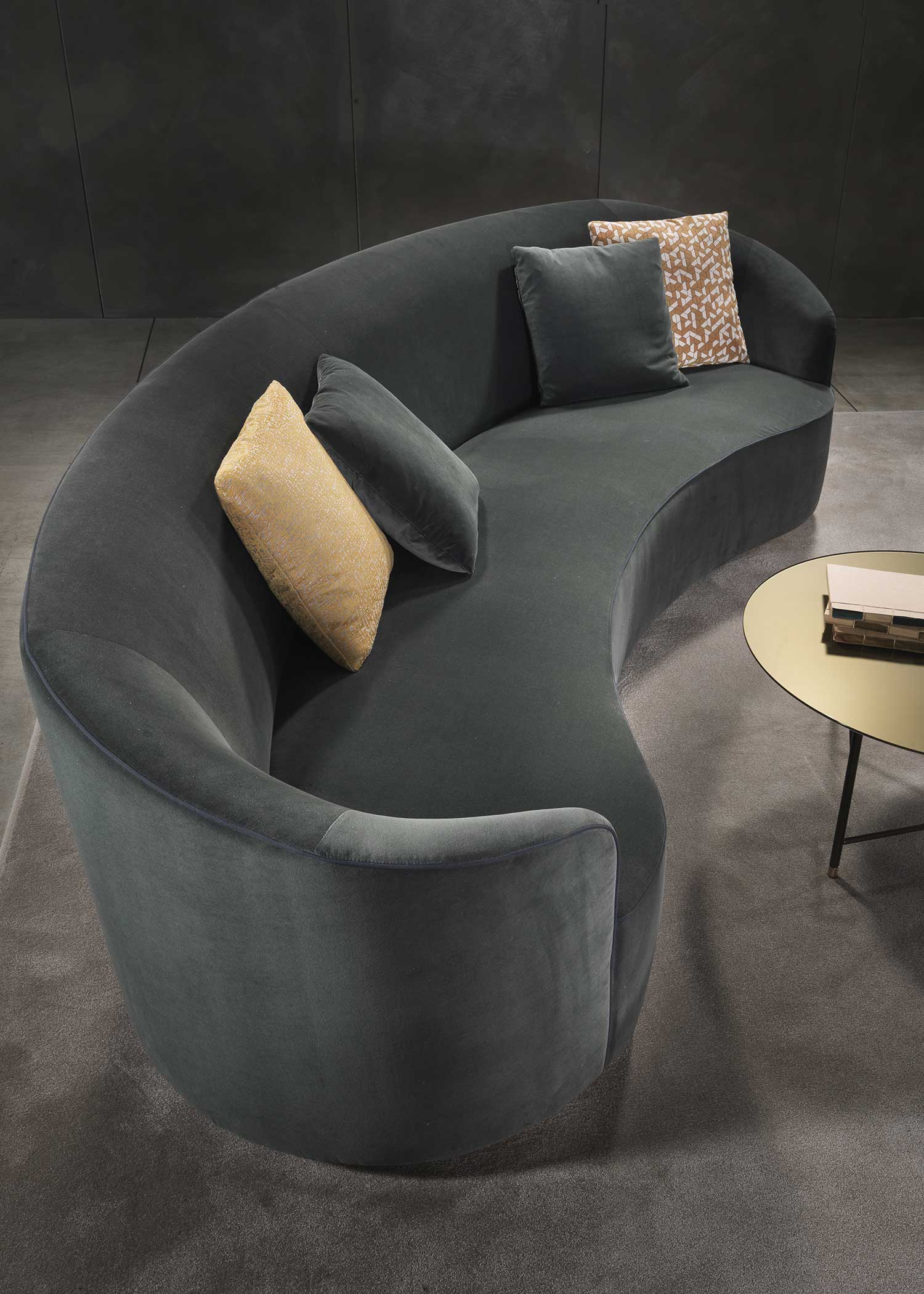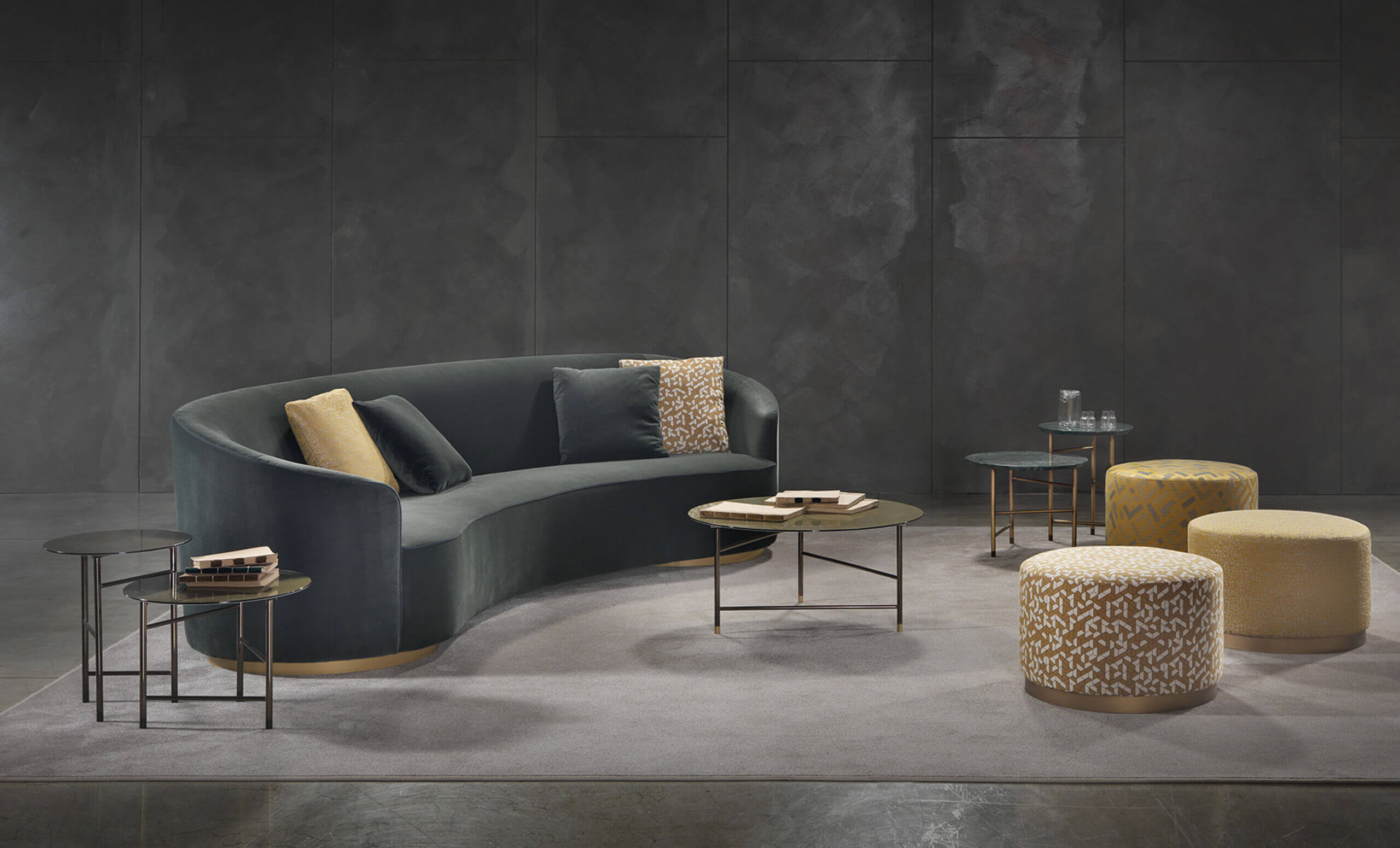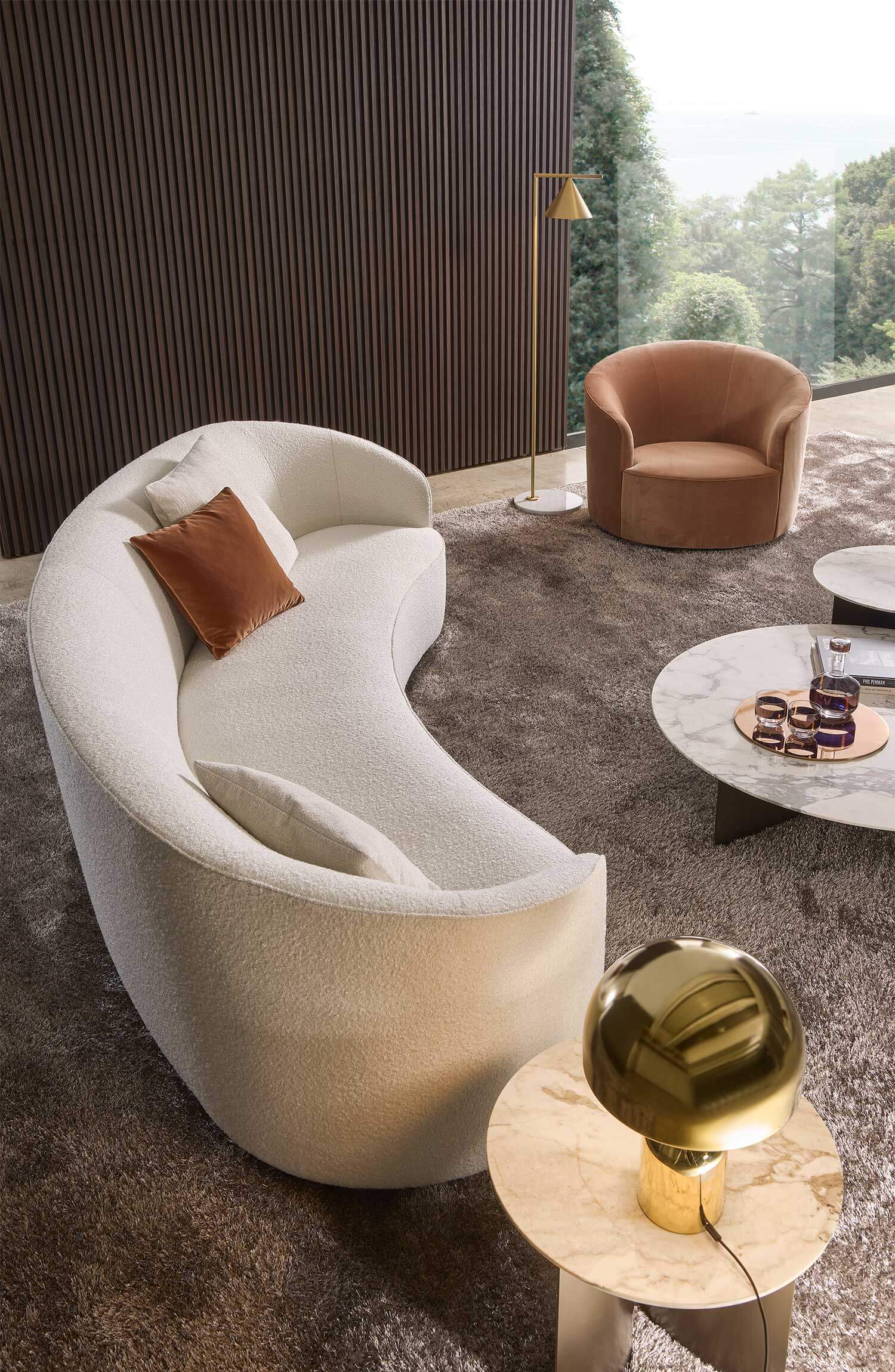 I divani, poltrone e pouf della collezione Moon sono caratterizzati da linee curve ed eleganti, con volumi morbidi e arrotondati nelle parti imbottite e una base leggera in metallo su cui poggiano. Questa combinazione offre un design che si distingue per la sua leggerezza, ma al contempo presenta volumi solidi e compatti.