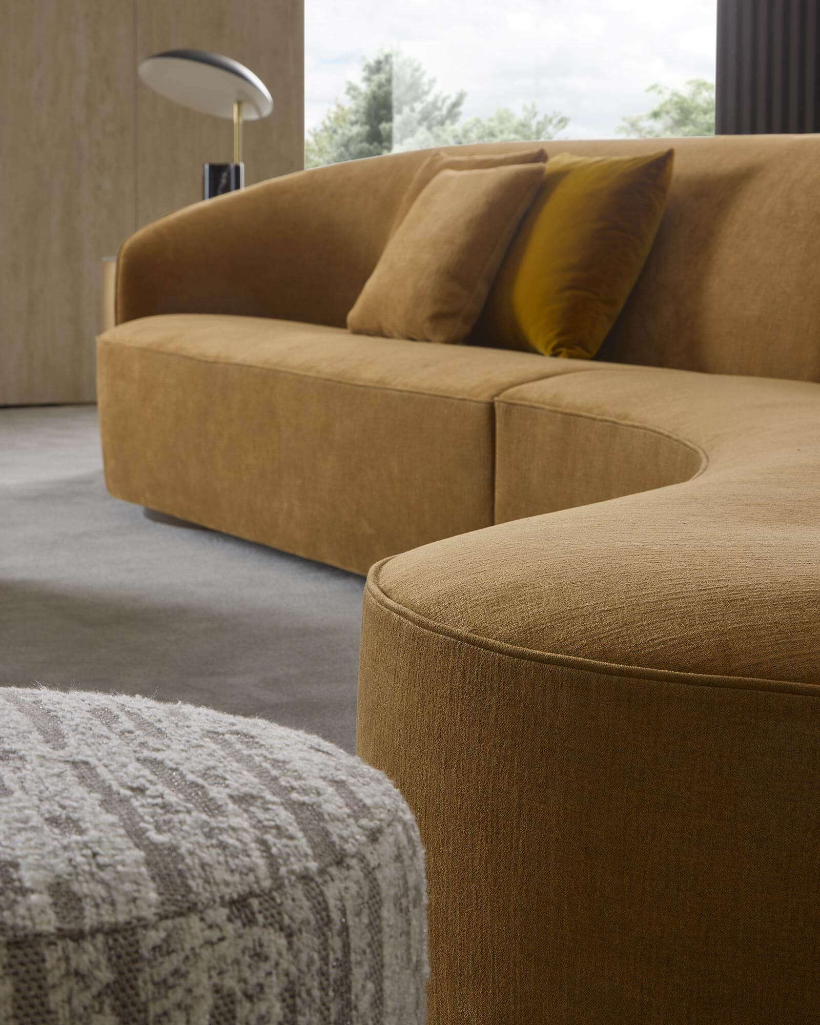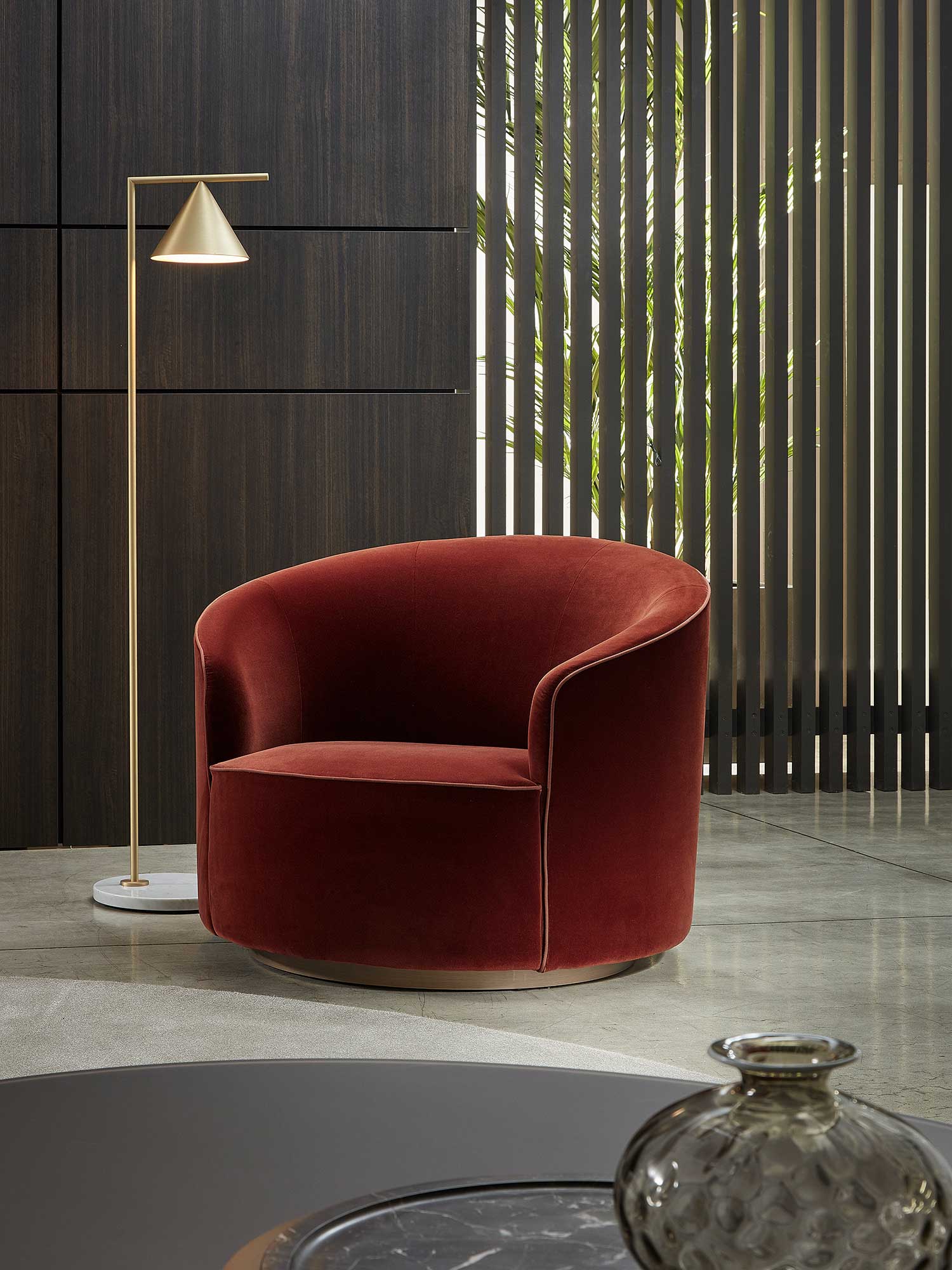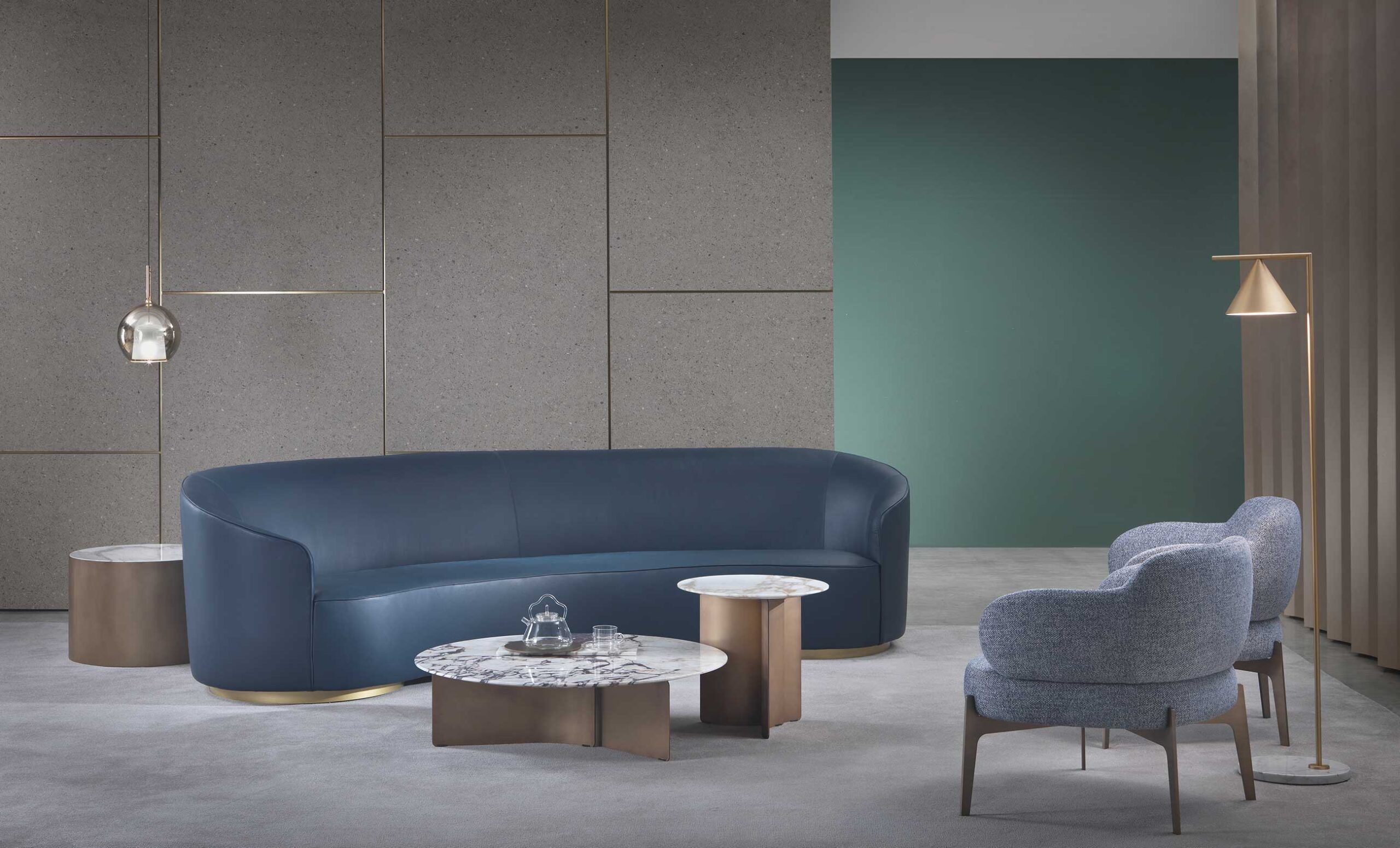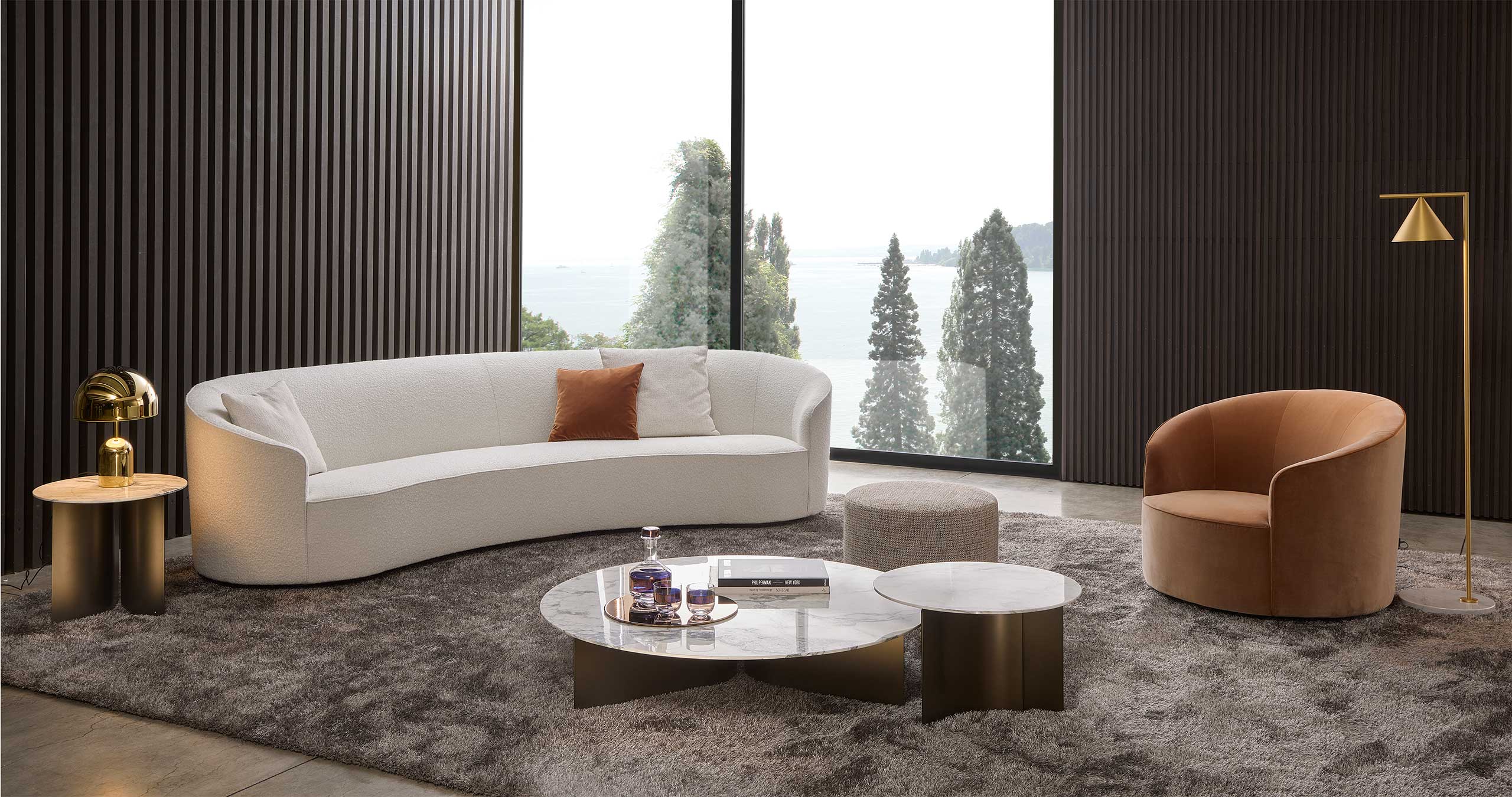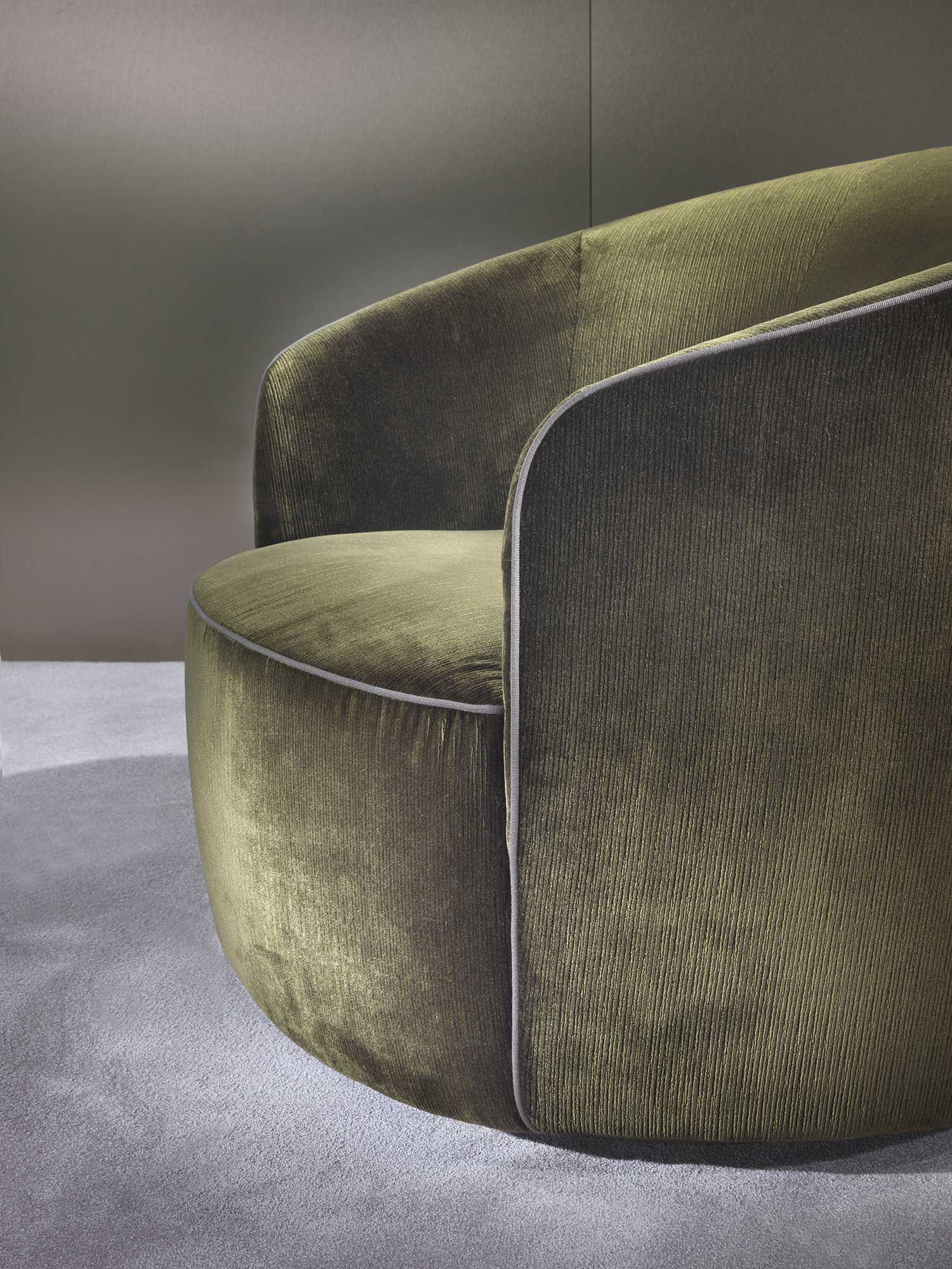 I divani, poltrone e pouf della collezione Moon sono caratterizzati da linee curve ed eleganti, con volumi morbidi e arrotondati nelle parti imbottite e una base leggera in metallo su cui poggiano. Questa combinazione offre un design che si distingue per la sua leggerezza, ma al contempo presenta volumi solidi e compatti.