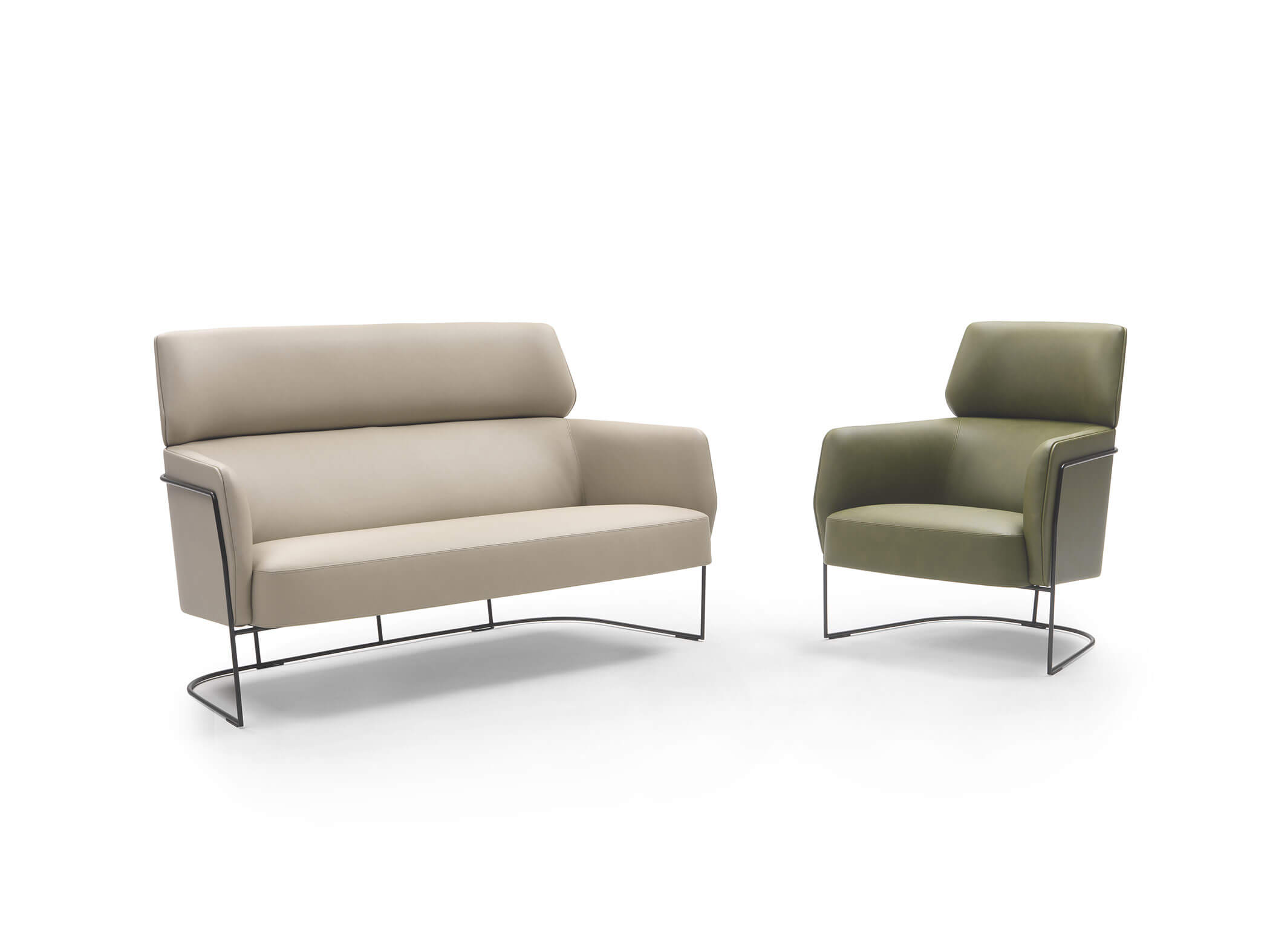 La morbida e curvilinee scocca viene sorretta da un elegante struttura in metallo disponibile in diverse finiture.