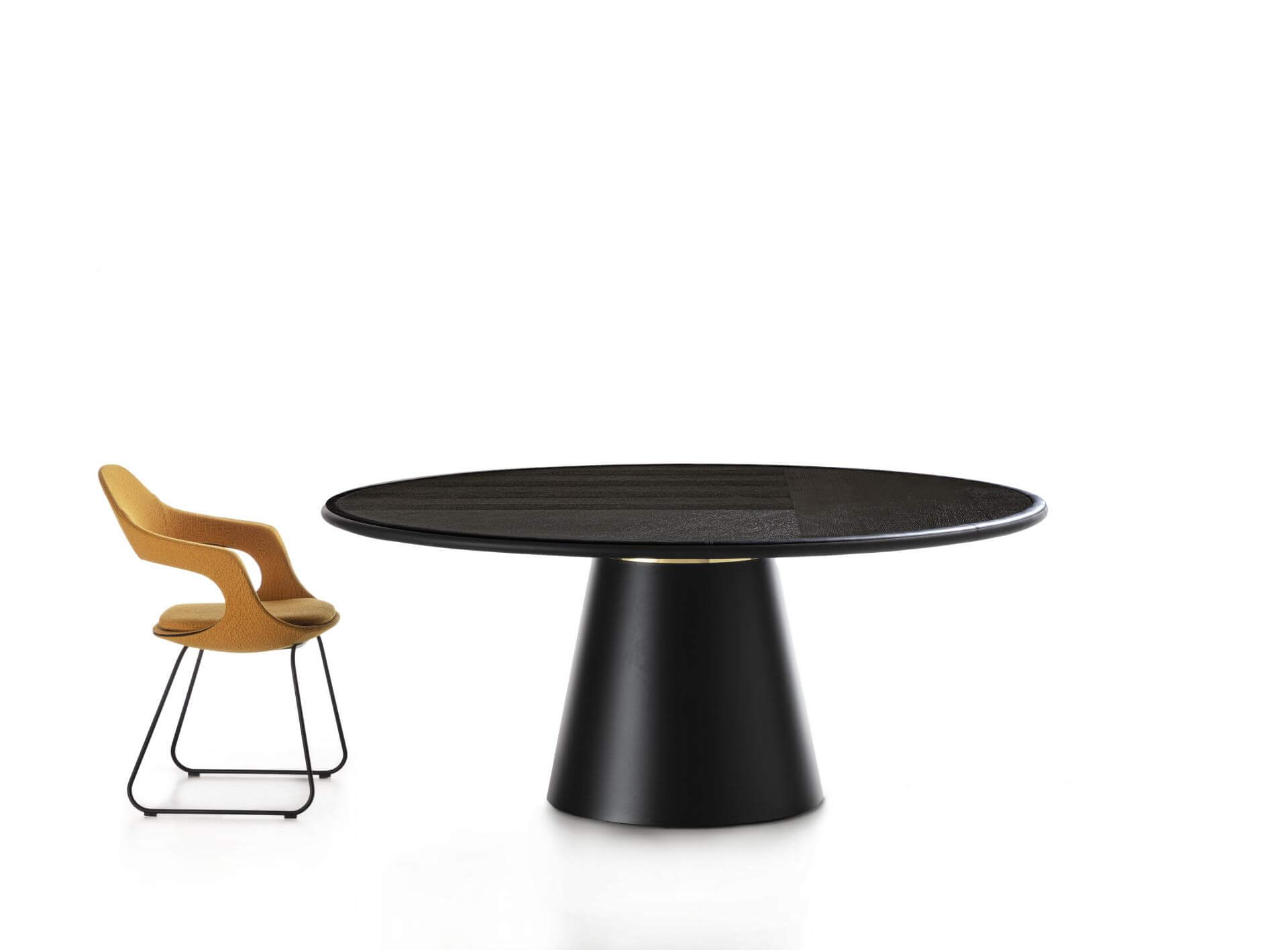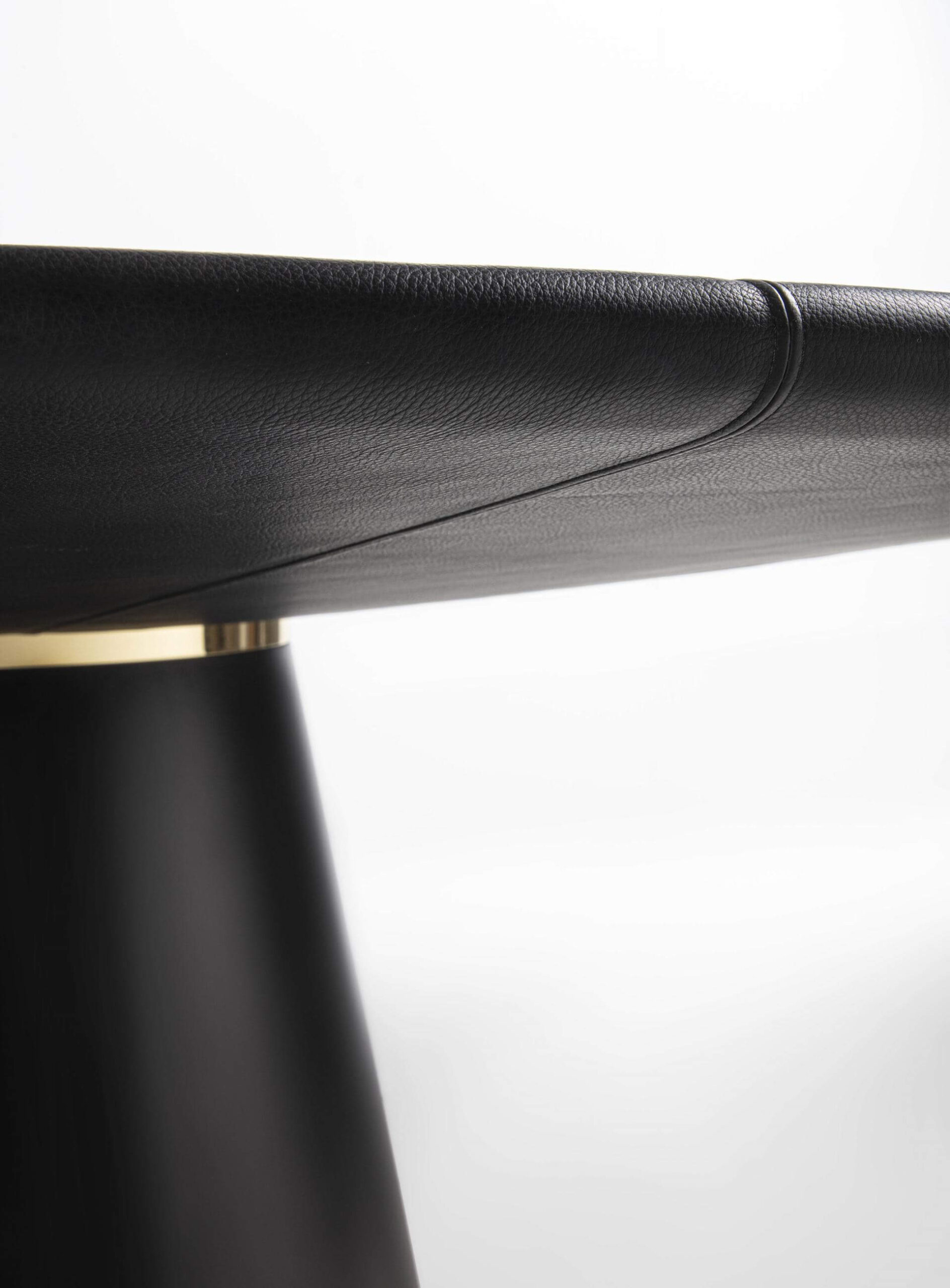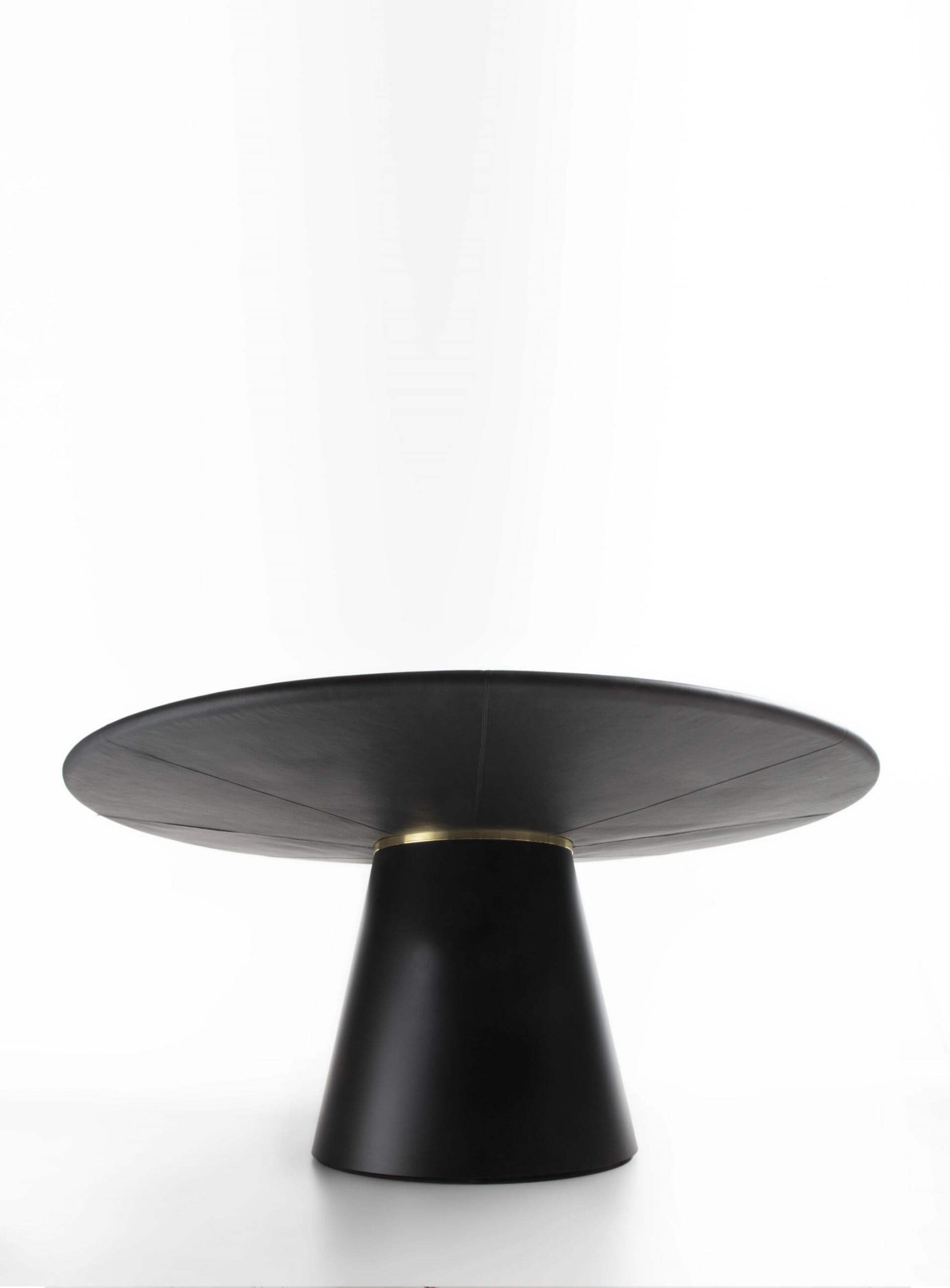 Tavolo con basamento conico in metallo verniciato o rivestito in pelle, sottopiano rivestito in pelle, con anello in ottone e piano tondo in legno. Piano a Ø180, disponibile in altre dimensioni a consuntivo.