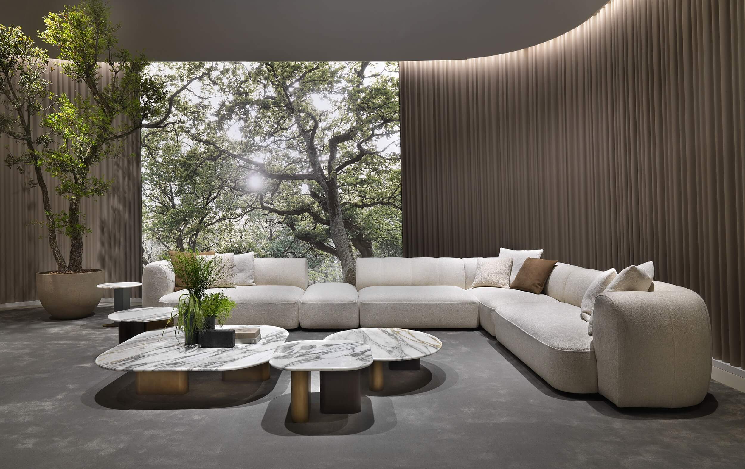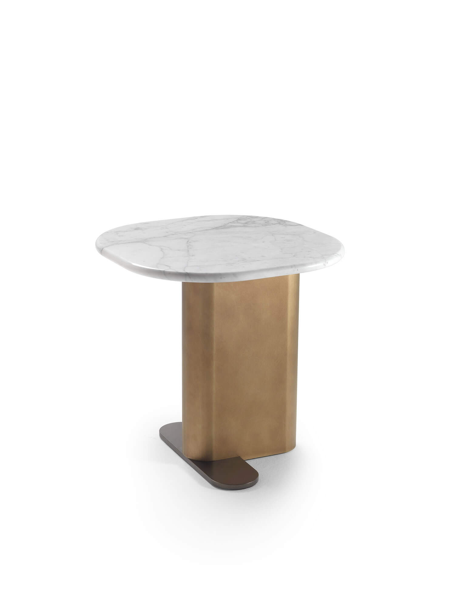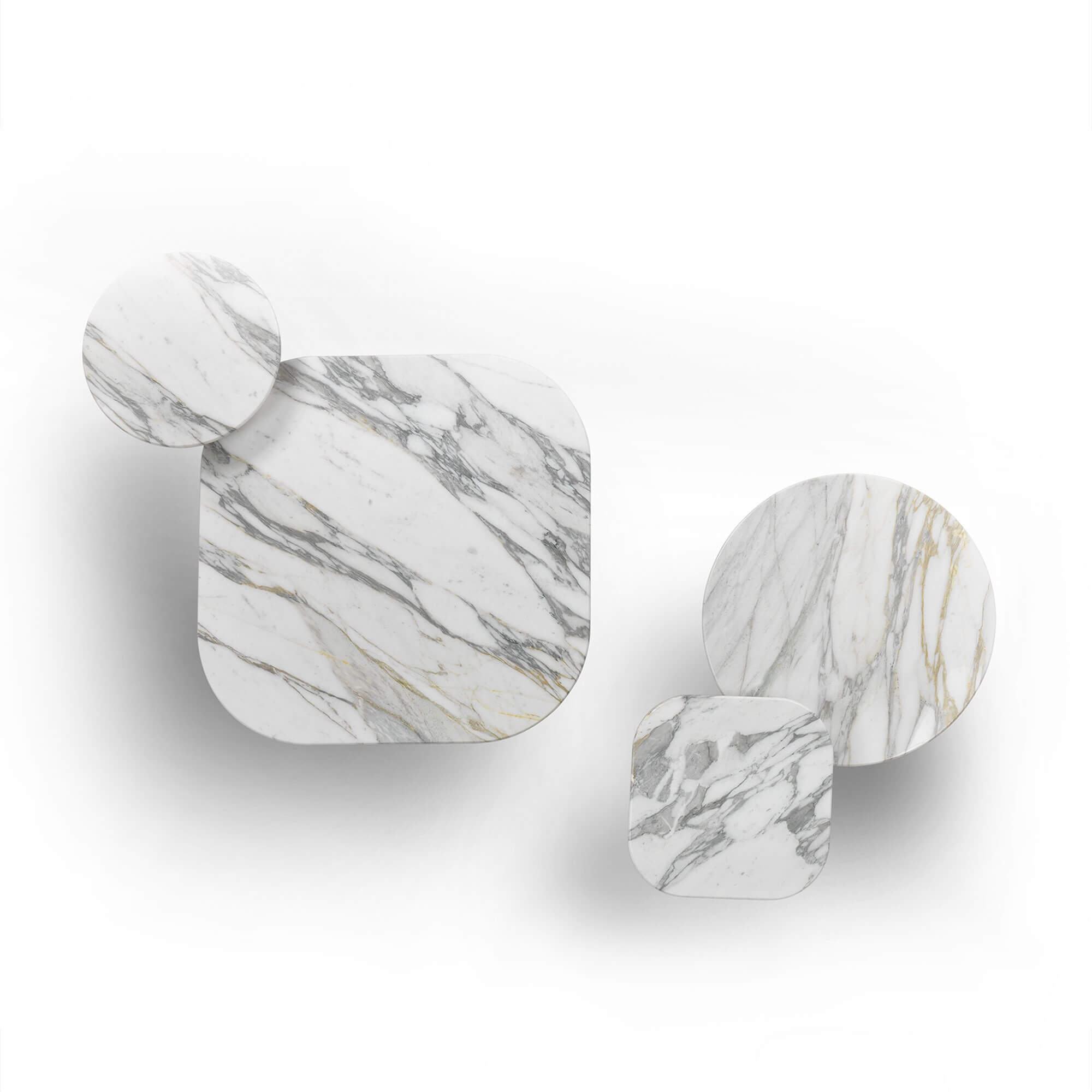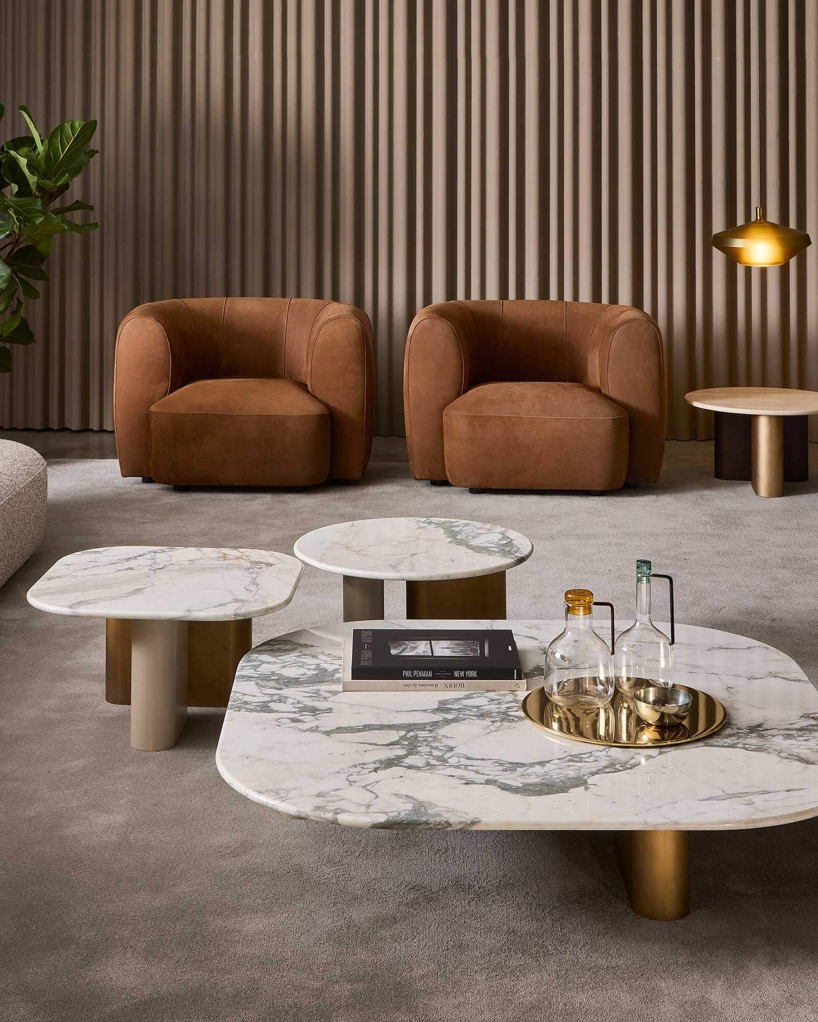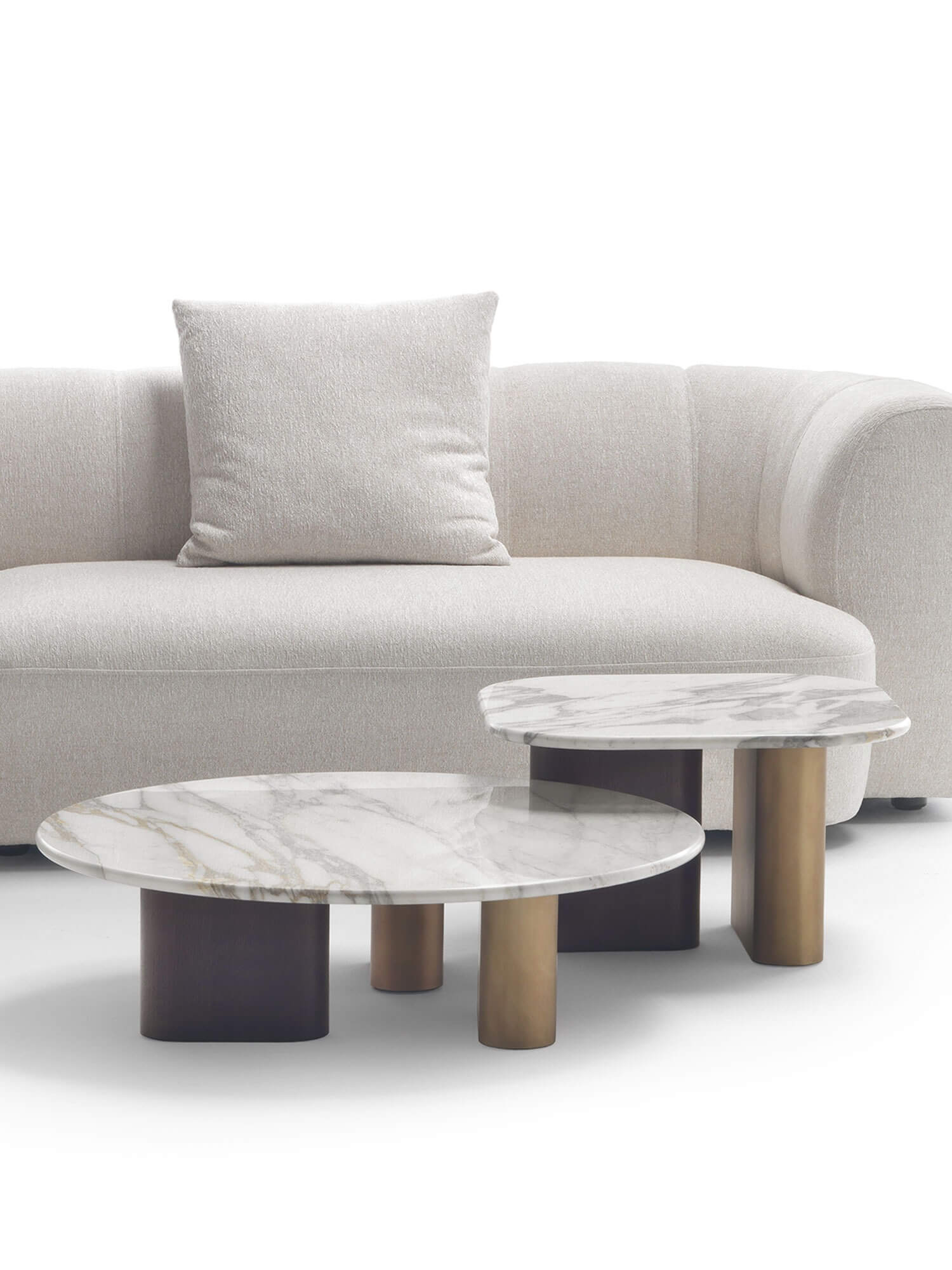 I piani dei tavoli e dei tavolini sono disponibili in 18 varianti di marmo, con forme rettangolari, quadrate o tonde, per adattarsi a ogni contesto residenziale e contract di alto livello.