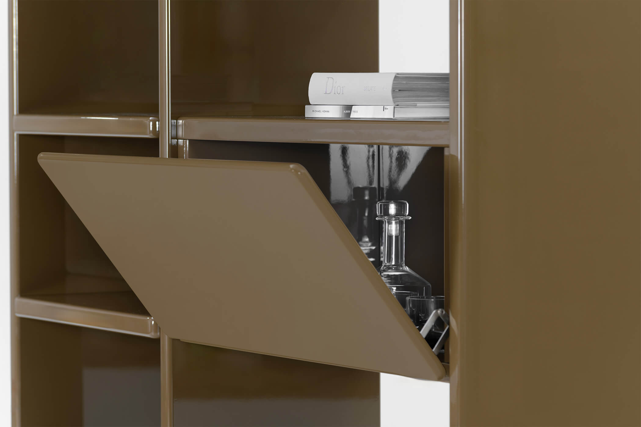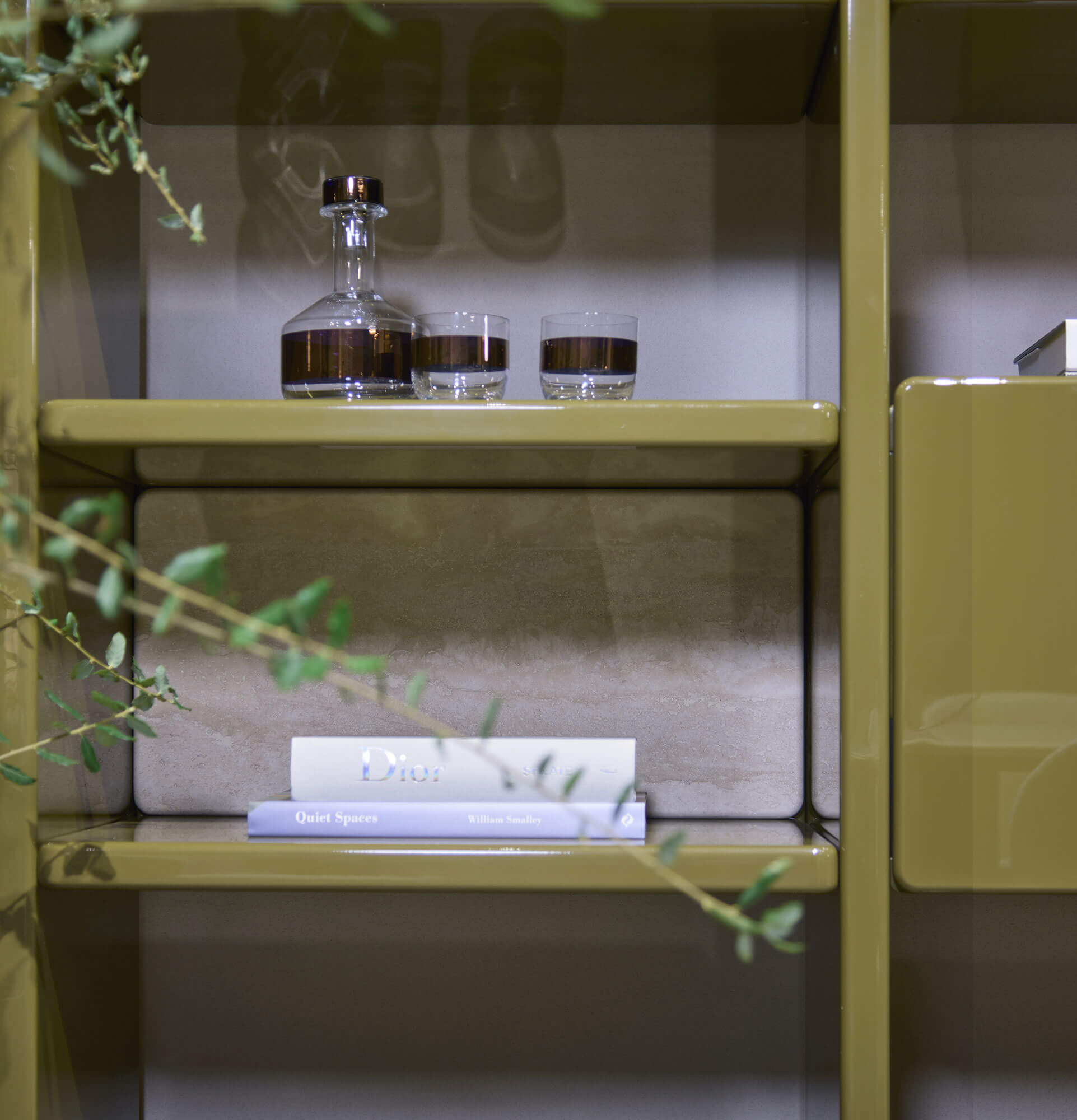 La struttura, che può essere rifinita con laccatura lucida o opaca in qualsiasi colore RAL, garantisce la massima flessibilità cromatica per integrarsi o spiccare nel progetto. Pur mantenendo il suo look essenziale, Pierre integra due vani di servizio pensati per la cura del dettaglio: una nicchia aperta è caratterizzata da una lastra di marmo a contrasto. Un secondo vano è chiuso da un’anta a ribalta, offrendo una soluzione contenitiva discreta.