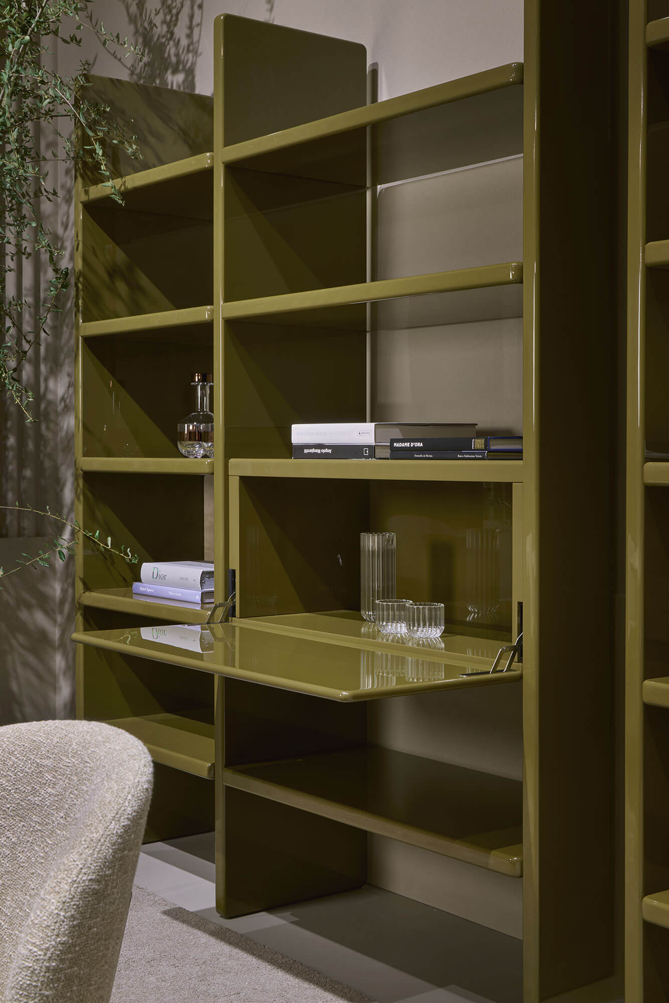 Pierre si propone come un prodotto dal forte impatto visivo, un omaggio all’estetica minimalista e audace degli anni ’70. La sua identità è definita dalla semplicità delle forme, con montanti e ripiani di spessore che disegnano una griglia aperta.