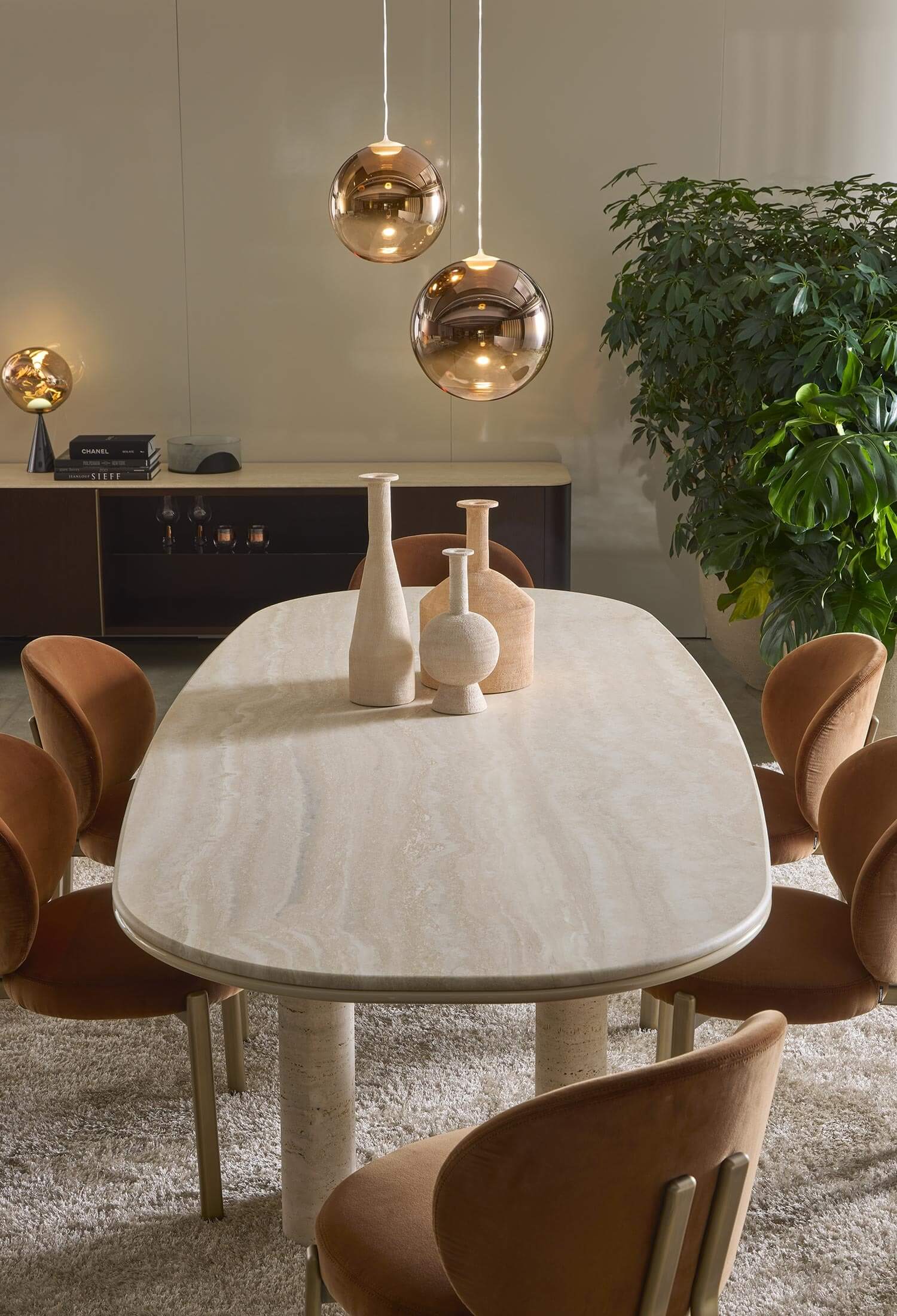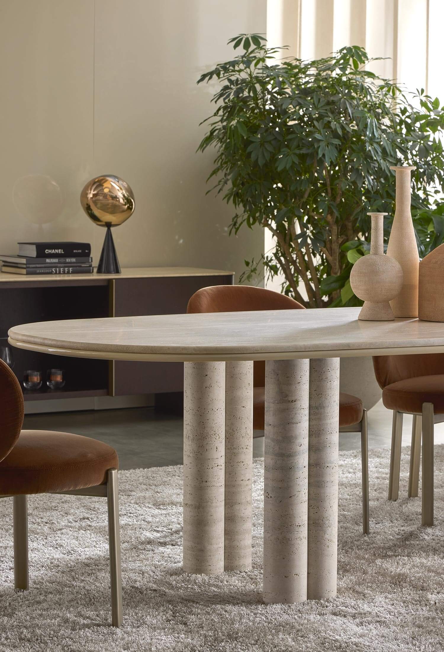 Le gambe dei tavoli sono realizzate un unico blocco di marmo: doppia nella versione da pranzo e cilindrica nei tavolini., disponibile in tutte le sue colorazioni.