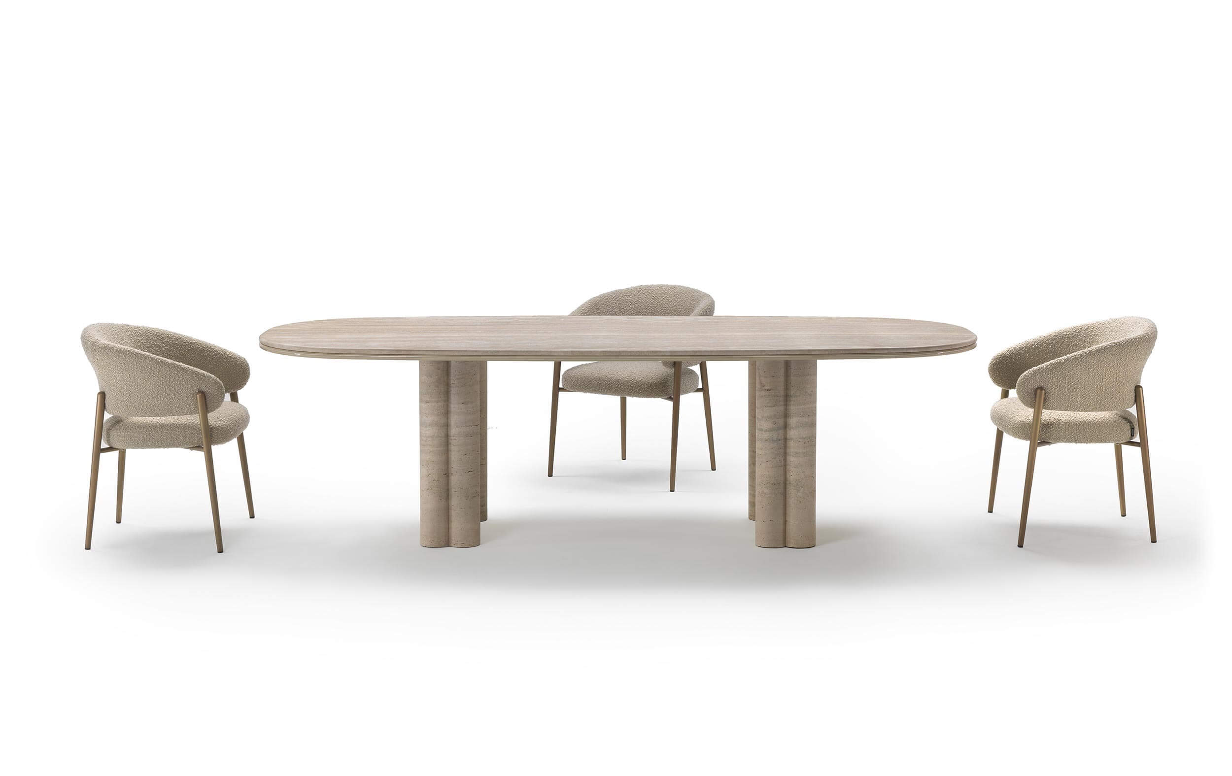 La famiglia di tavoli da pranzo e tavolini Simmy si caratterizza per la sua forma moderna, organica quasi scultorea, che conferisce loro una grande leggerezza nonostante i volumi.